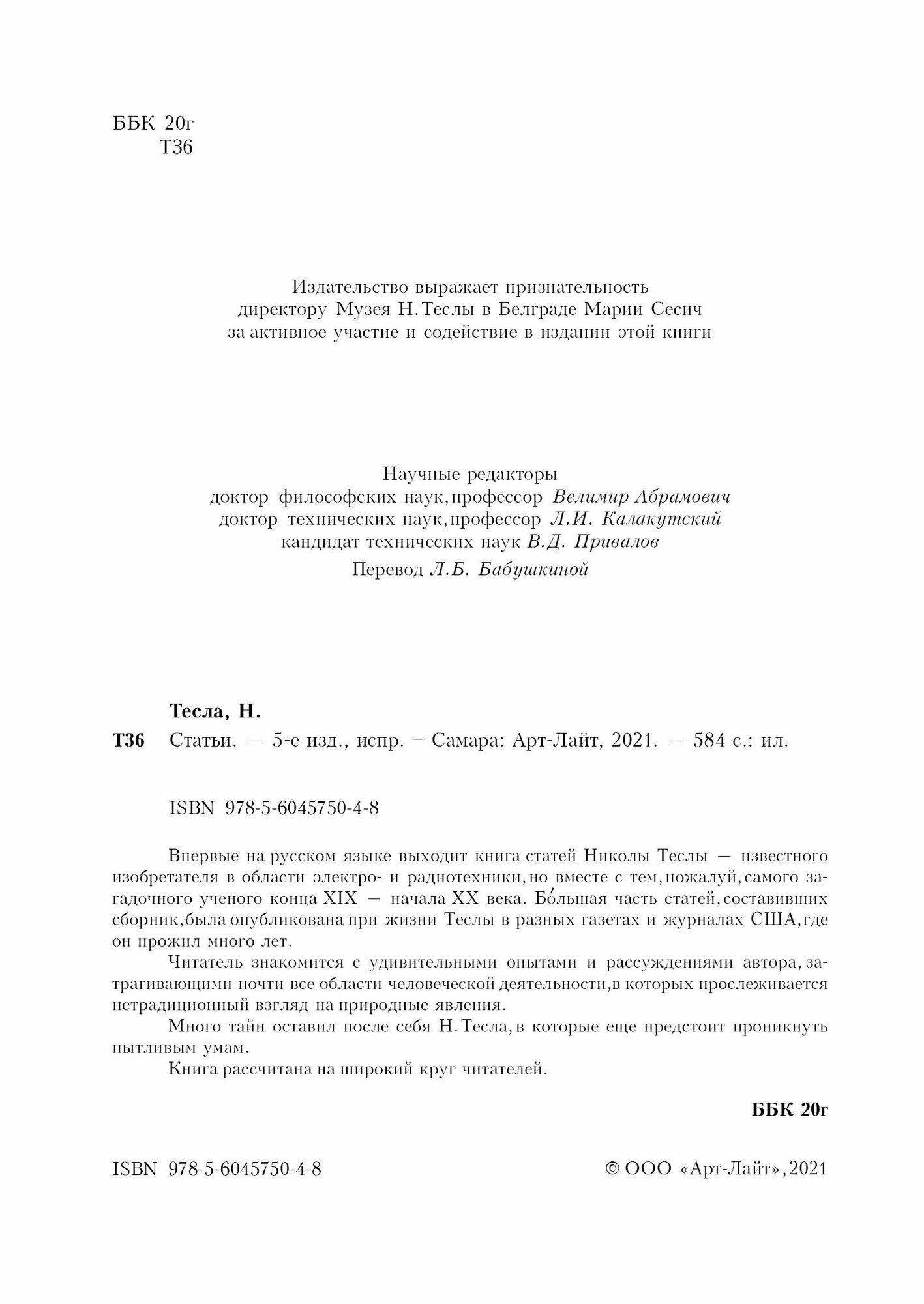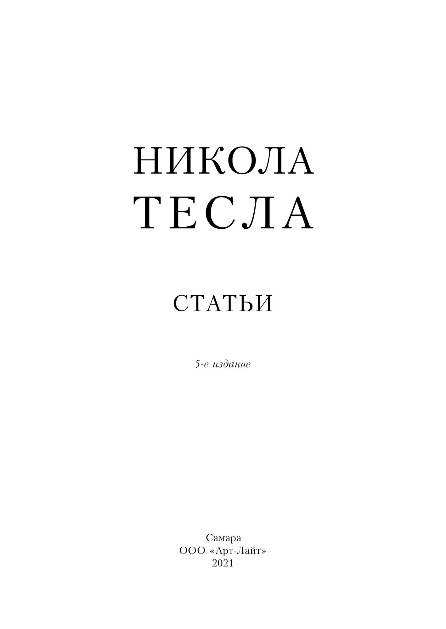 Книга: Статьи (Тесла Никола); Арт-Лайт, 2021