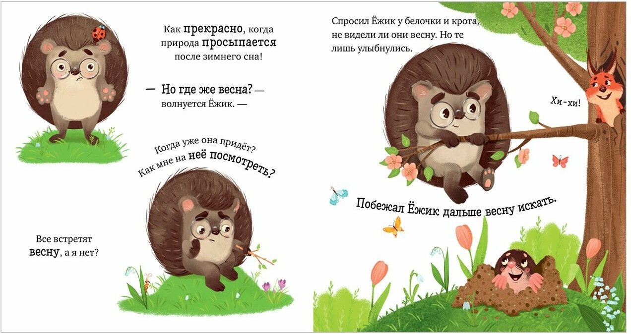 Книга «Приключения Ежика. Весна» в форме увлекательной сказки поделится с ребенком первыми научными знаниями: как определять время года по его приметам, почему надо одеваться по погоде, как различать зверей, птиц и растения, которые встречаются весной, расскажет об основных природных явлениях и смене сезонов.