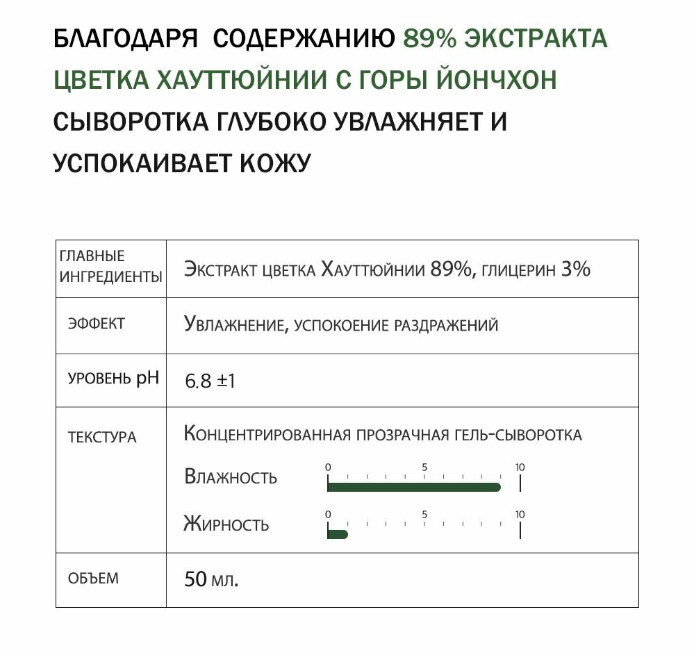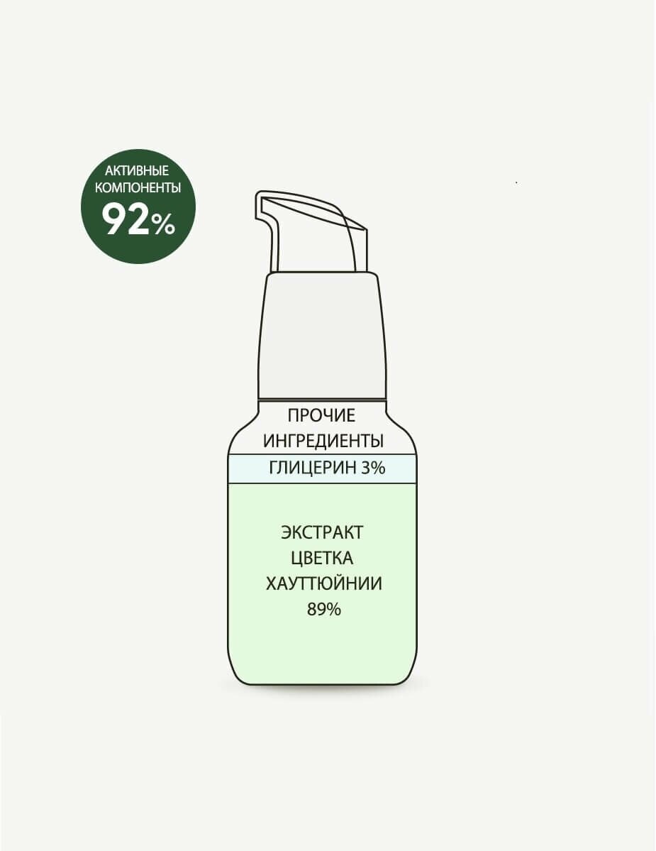 Увлажняющая успокаивающая сыворотка содержит 92% активных ингредиентов для успокоения чувствительной кожи и немедленного насыщения влагой для долговременного увлажнения. Экстракт цветка хауттюйнии извлекается при низкой температуре 40 градусов в течение 17 часов для минимизации потери полезных свойств. Концентрированная бесцветная гелевая сыворотка обильно увлажняет, дарит чувство свежести, освобождая от обезвоживания.