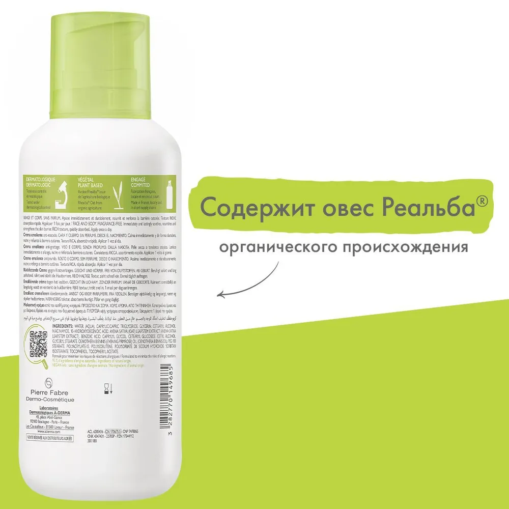 Смягчающий крем для лица и тела A-derma exomega control 400 мл (600583)