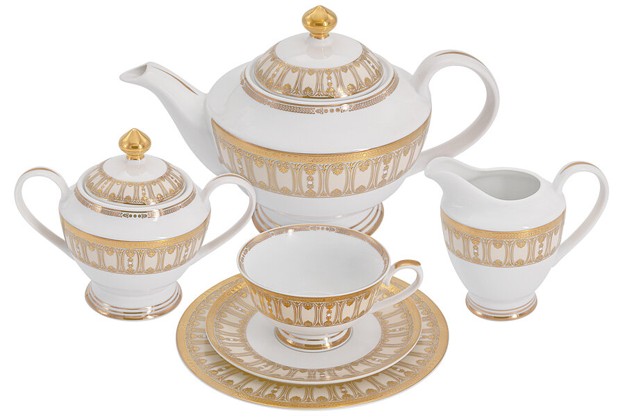 | Комплектация | Чашка чайная 200мл - 6шт; блюдце - 6шт; тарелка десертная 19см - 6шт; чайник заварочный 1,4л - 1шт; сахарница 450мл - 1шт; молочник 300мл - 1шт |