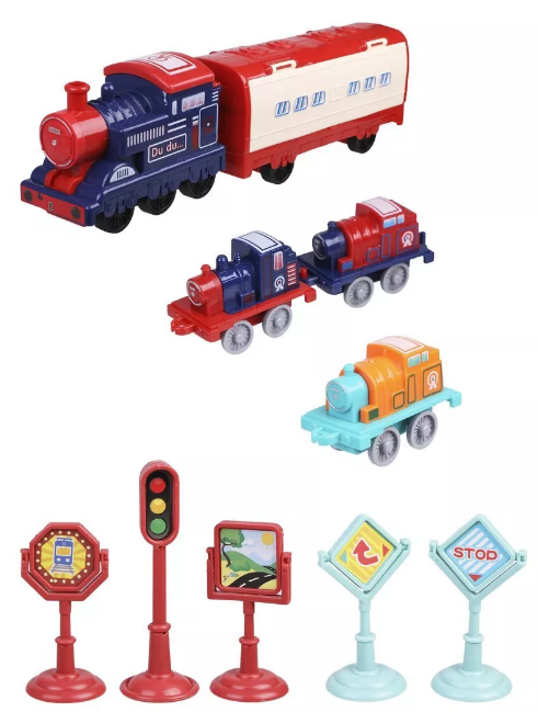 Игровой набор «Путешествие» включает поезд с инерционным механизмом движения, вагон, 3 мини-поезда без механизмов, 5 дорожных знаков и наклейку.