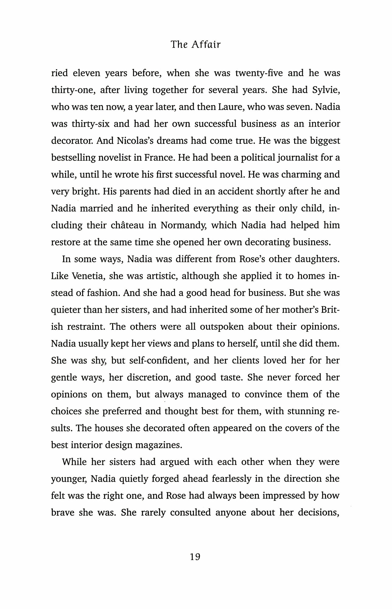 Living in an elegant apartment overlooking the Seine, Nadia had considered her life perfect, married to bestselling novelist Nicolas Bateau, who adored her and their two daughters. But then the tabloid press leak a story of Nicolas's affair with a dazzling young actress.
