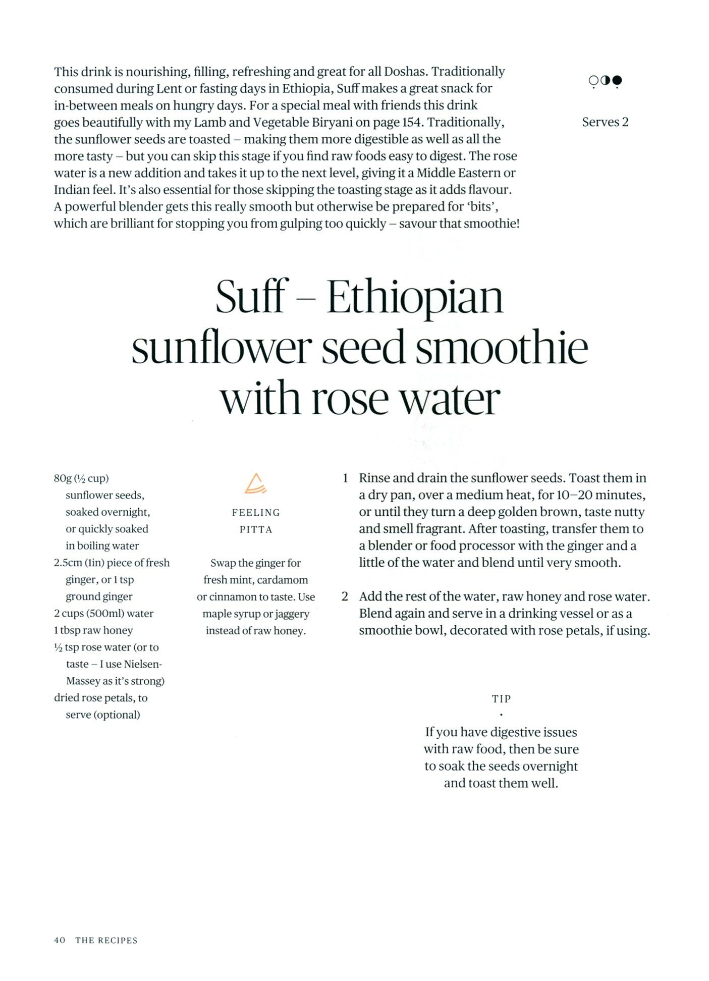 With classic Ayurvedic comfort dishes from Golden Milk to Kitchari and great family sharing dishes Sesame Roast Chicken to Saffron Millionaire Cheesecake, the book has something for every taste (bringing to life store cupboard basics to create dishes) from super simple to simply special. A global range of recipes, together with simple mindful rituals and a classic cleanse to revisit when your energy levels need a boost help the book bring Ayurveda to life in a fresh and friendly way.