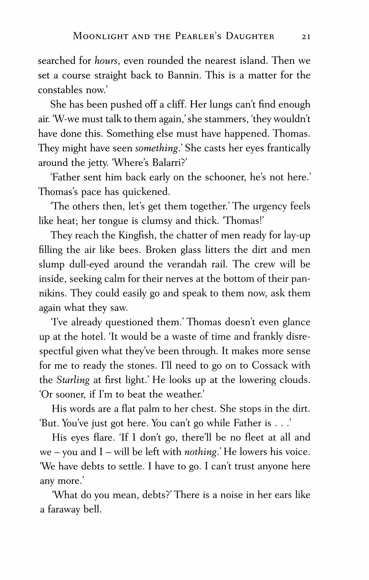 Ten years later and Charles Brightwell, now the bay's most prolific pearler, goes missing from his ship while out at sea. Whispers from the townsfolk suggest mutiny and murder, but headstrong Eliza, convinced there is more to the story, refuses to believe her father is dead, and it falls to her to ask the questions no one else dares consider.