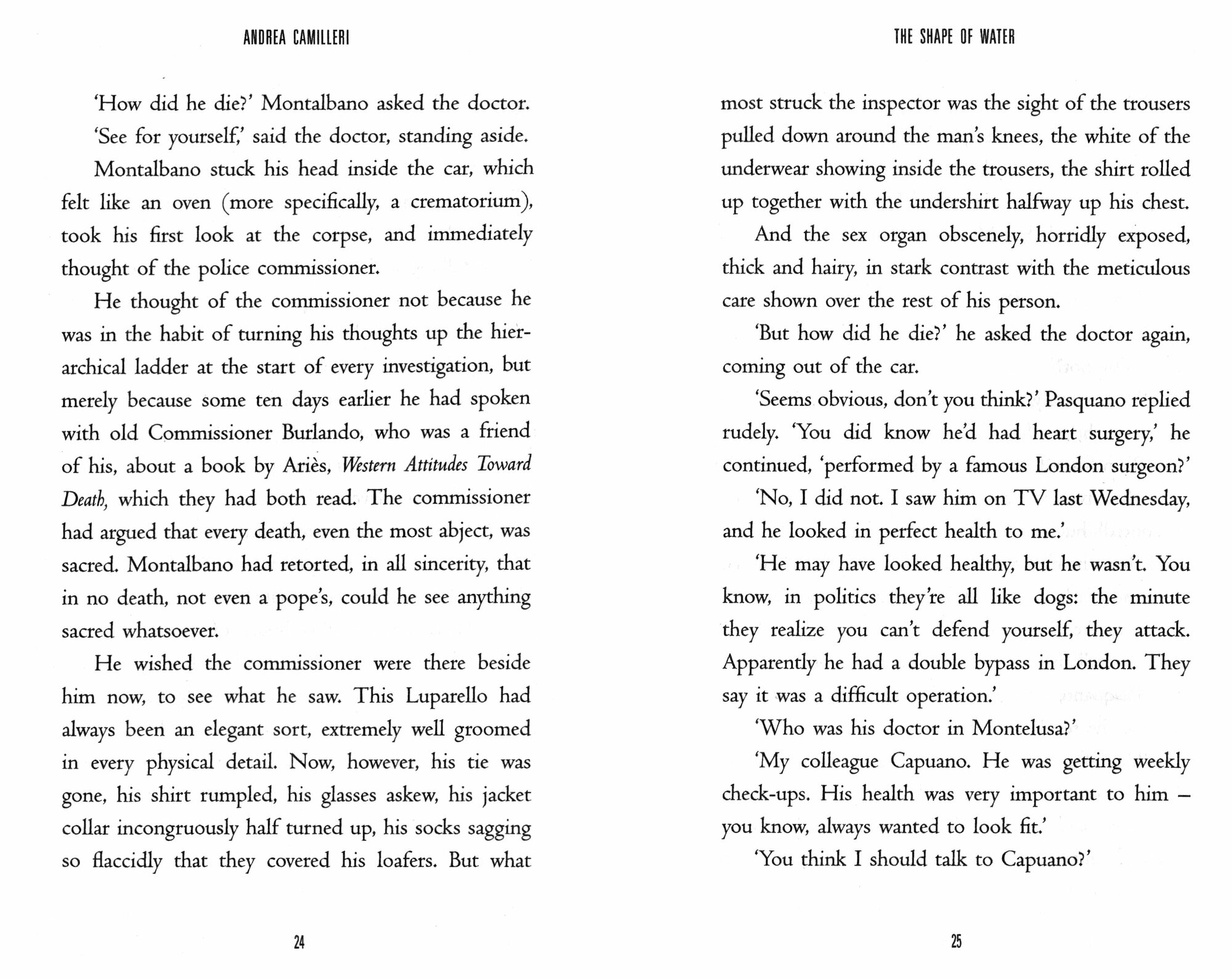The Shape of Water: On a waste ground in Vigata, the Sicilian town's dark underbelly flourishes: drug dealers and prostitutes plying their trade. But when the body of Silvio Luparello, one of the local movers and shakers, is discovered there, Inspector Montalbano must investigate; and despite pressure from his commissioner, a local judge and bishop - he is determined to unearth the truth...