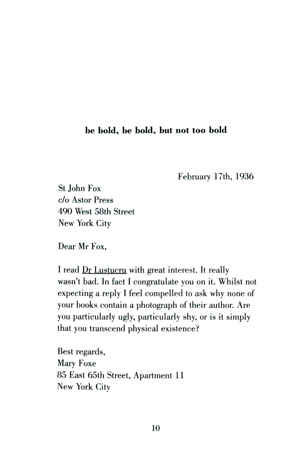 It's a bright afternoon in 1938 and Mary Foxe is in a confrontational mood. St John Fox, celebrated novelist, hasn't seen her in six years. He's unprepared for her afternoon visit, not least because she doesn't exist. He's infatuated with her. But he also made her up.