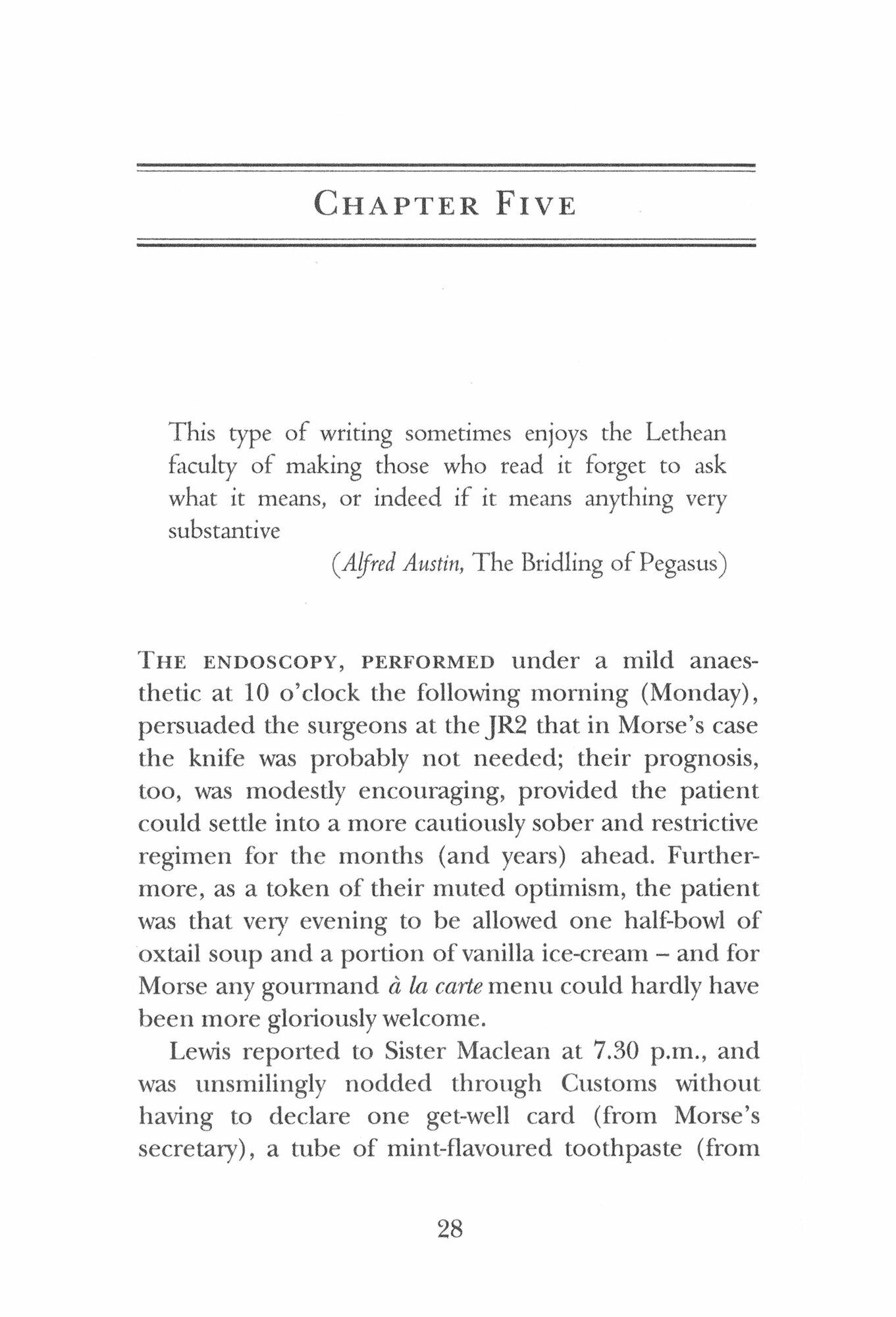 At around 10.15 a.m. on a Saturday morning in 1989 the body of Chief Inspector Morse - though very much alive - was removed to Oxford's John Radcliffe Hospital. Treatment for a perforated ulcer was later pronounced successful.