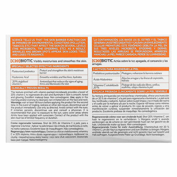 Крем способствует регенерации кожи благодаря комбинации 3 активных компонентов, необходимых для функционирования кожи - пастеризованные пробиотики, оптимизированный витамин С и гиалуроновая кислота. Текстура крема обогащена микрогранулами витамина Е, которые мгновенно проникают в кожу, оказывая антиоксидантное воздействие. Цвет лица заметно освежается.