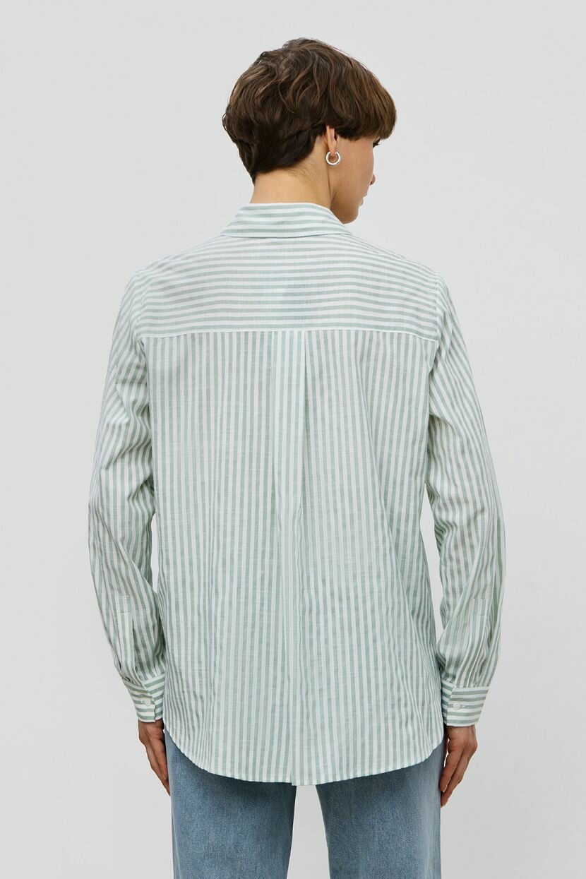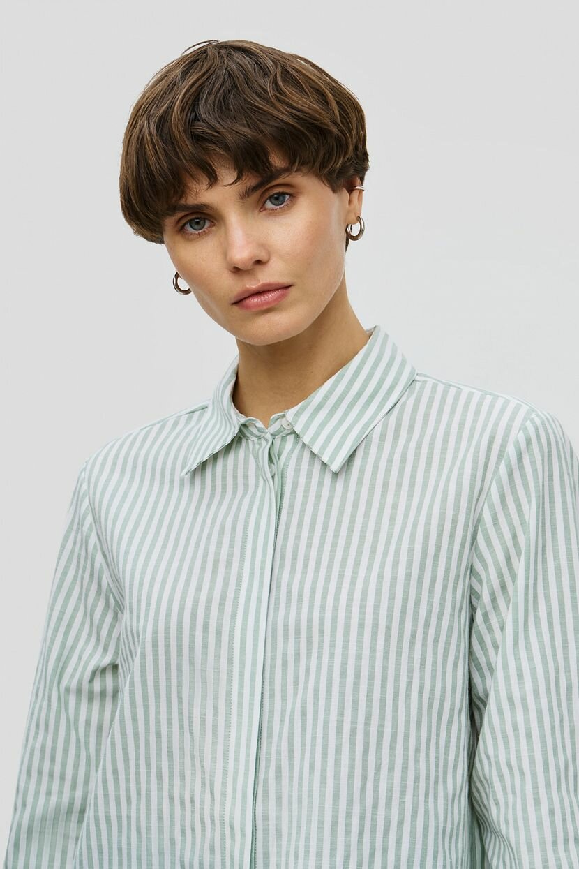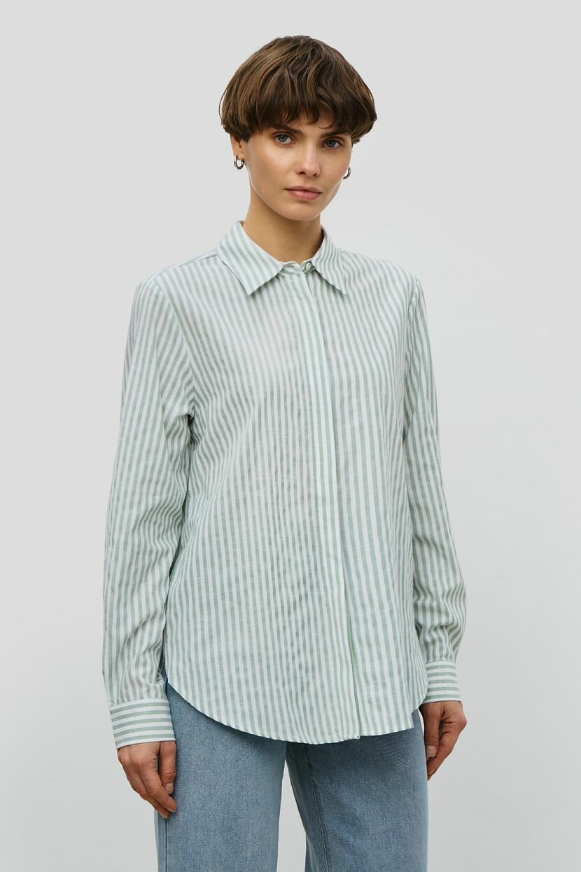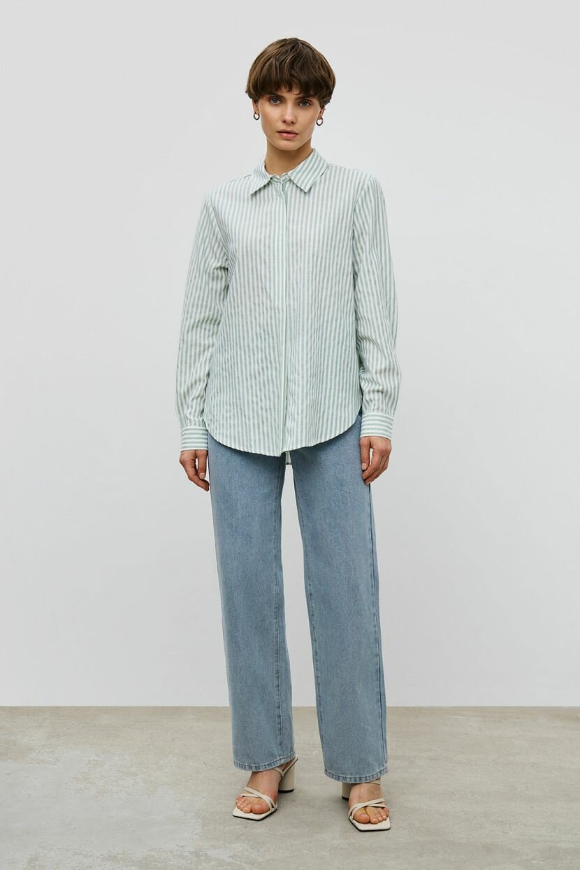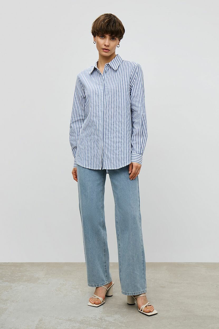 Блузка женская рубашечного кроя с отложным воротником застегивается на пуговицы, прикрытые планкой. Рукава свободного кроя, сужаются к низу в манжеты с застежками-пуговицами. Низ изделия имеет зауженную и закругленную форму. Вертикальные полоски вытягивают и стройнят силуэт, таким образом, эта рубашка уравновесит любой тип фигуры.