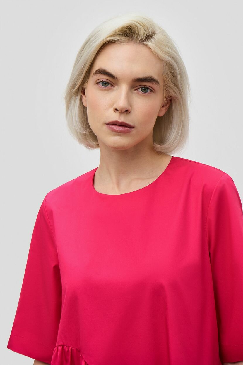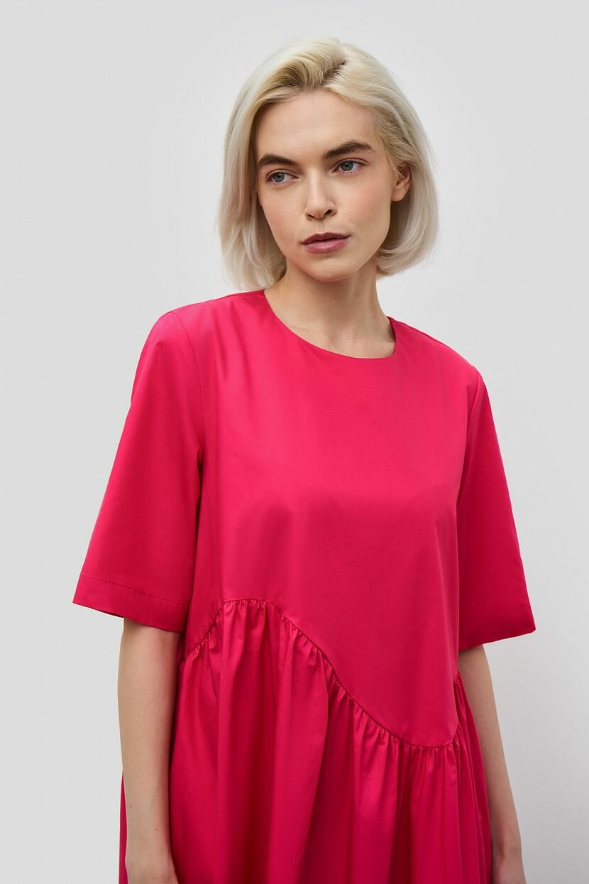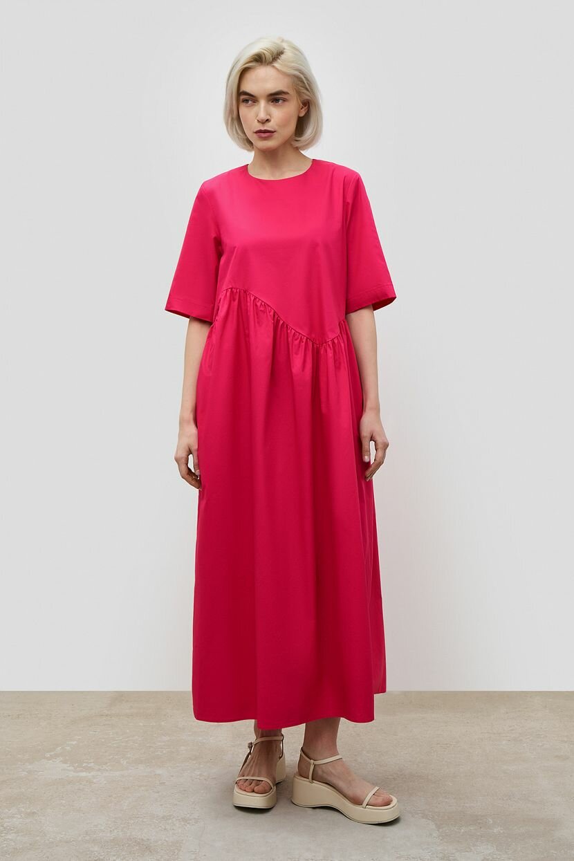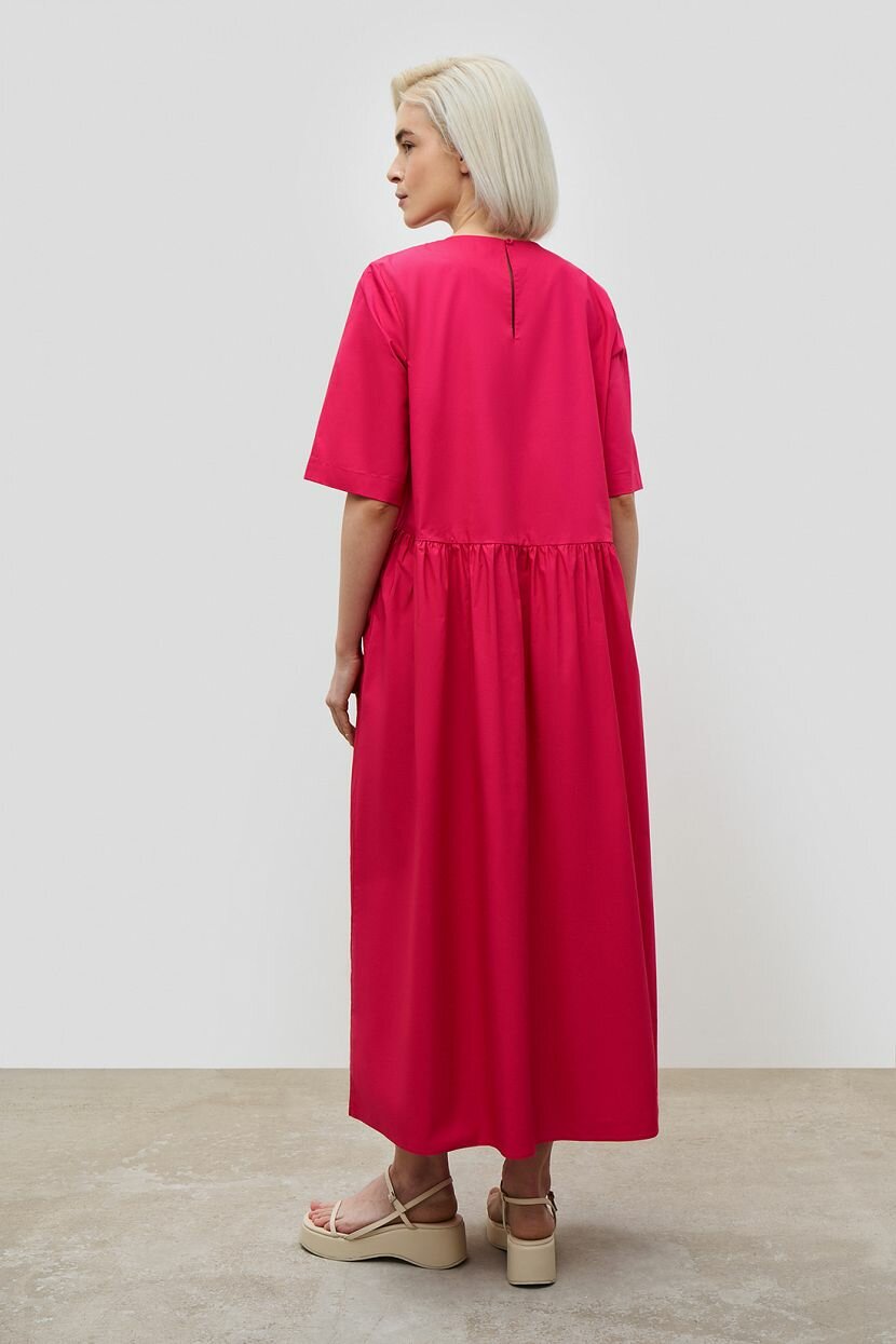 Однотонное платье миди с короткими рукавами и круглым вырезом горловины выполнено из мягкого хлопкового поплина. Удобные карманы расположены в боковых швах. Модель гармонично соединяет сдержанный, лаконичный лиф и расслабленный низ с кокетливыми складками. Платье застегивается на спинке каплеобразным вырезом на пуговице. Свободные проймы и широкие рукава обеспечивают необходимый комфорт в зоне декольте, не стесняют движения. Натуральная ткань создает оптимальный теплообмен и в жару, и в прохладу. Хлопок хорошо пропускает воздух, регулирует тепло тела, не перегревая его. Гладкий, легкий поплин практически не ощущается при носке.