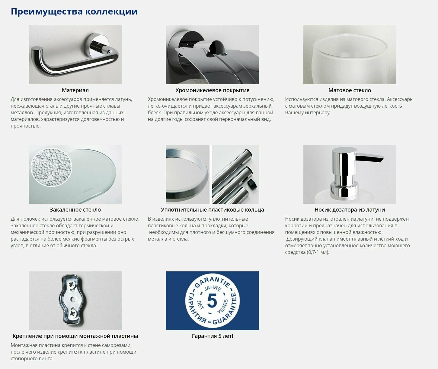 Мыльница для ванной комнаты. Материал: металл, хромоникелевое покрытие, уплотнительные пластиковые кольца, матовое стекло