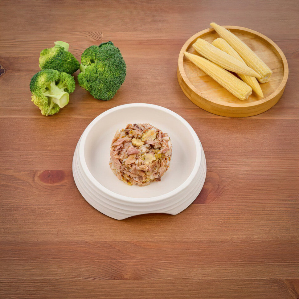 Состав: Тунец 50%, брокколи 4%, мини-кукуруза 4%, рис, очищенное подсолнечное масло, фруктоолигосахариды (ФОС) 0,04%. Питательная ценность: сырой белок 14%, сырая клетчатка 0,1%, сырой жир 2%, сырая зола 2%, влага 80% Энергетическая ценность: 865 ккал/кг. Питательные добавки в 1 кг: витамин Е (альфа-токоферол) 50 мг.