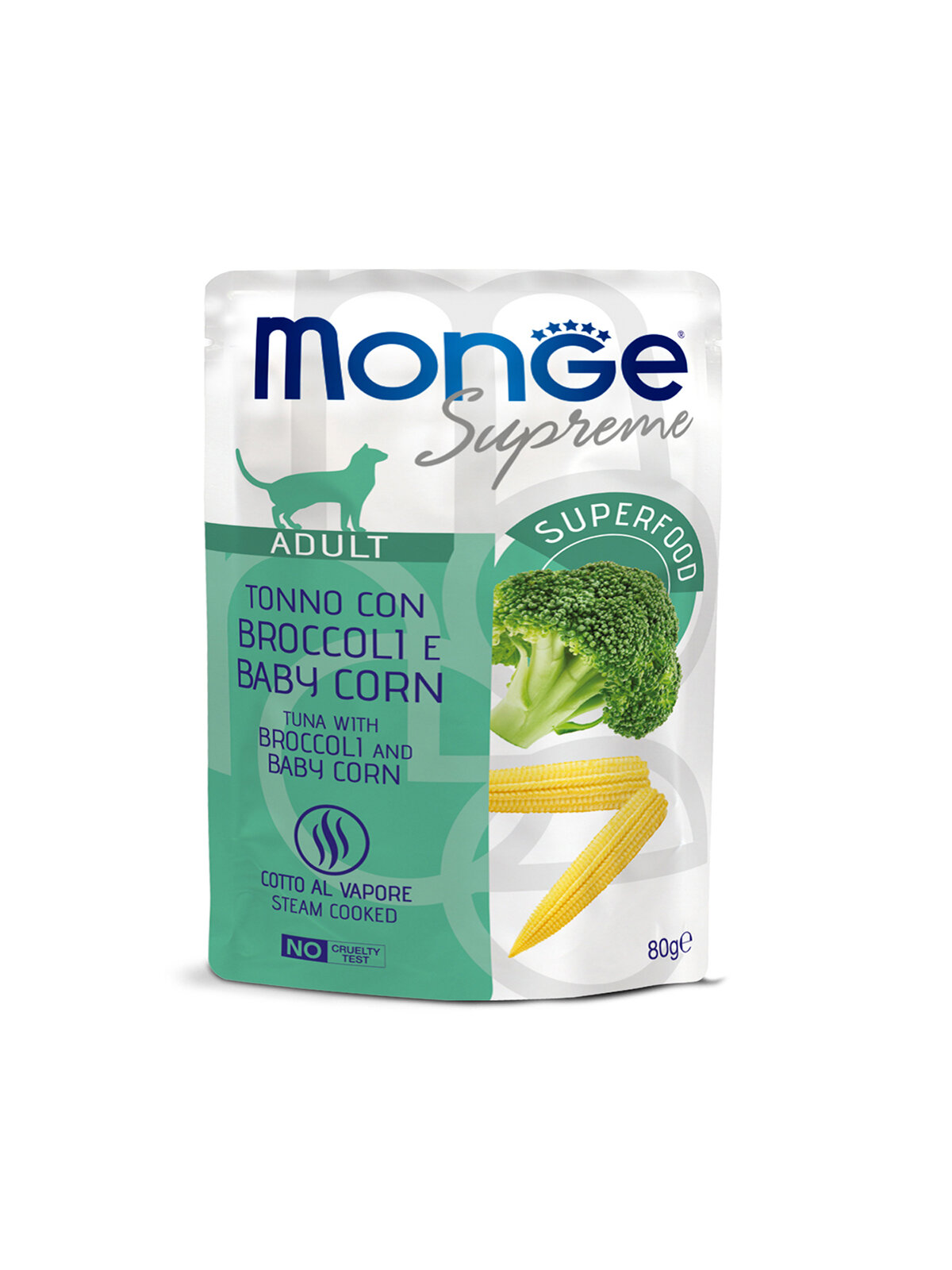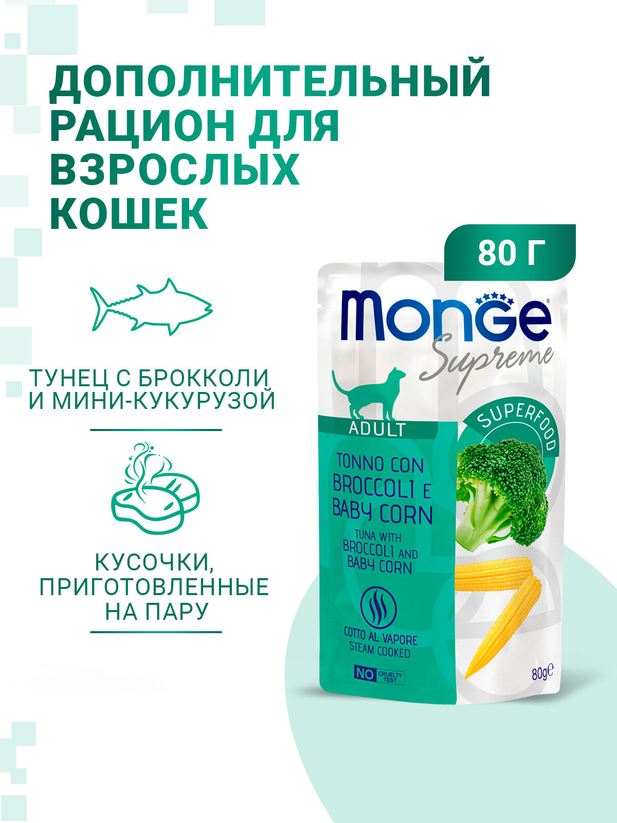 Влажный корм Monge Supreme Adult cat для взрослых кошек тунец с брокколи и мини-кукурузой, паучи 80 г