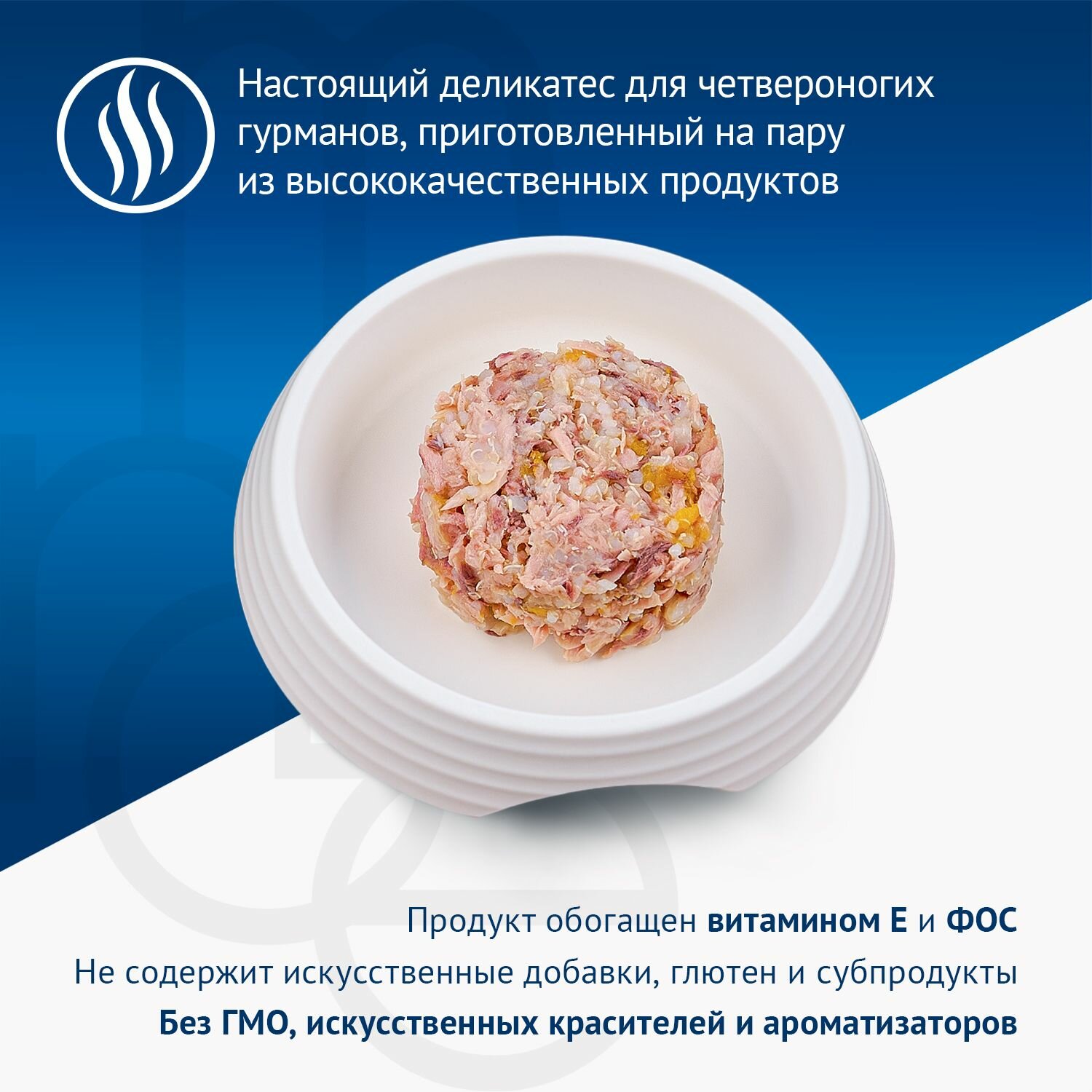 Дополнительный консервированный корм для стерилизованных кошек. Настоящий деликатес для четвероногих гурманов приготовленный на пару из высококачественных продуктов на основе свежего тунца, который является источником белка высокой пищевой ценности.