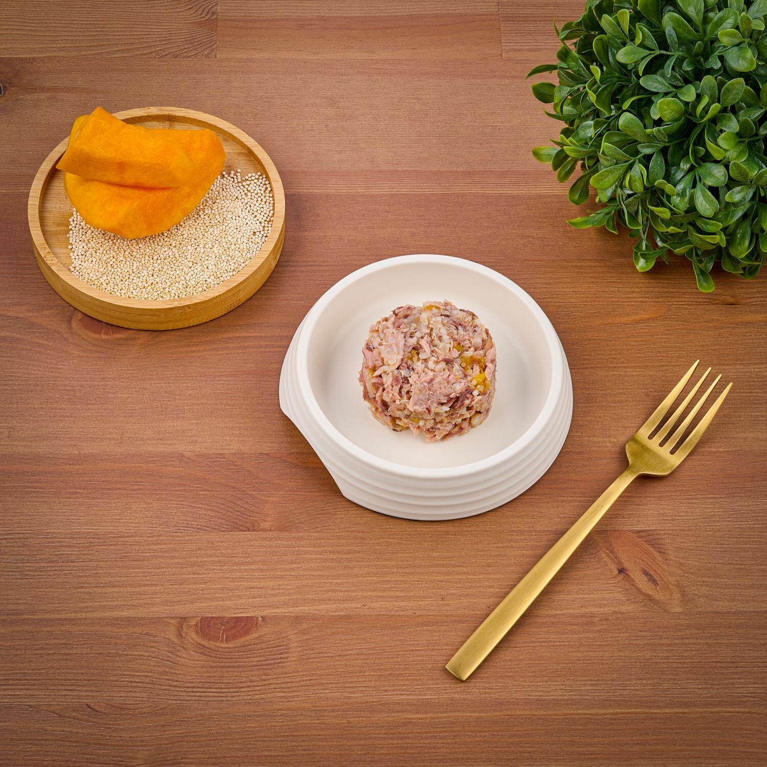 Состав: Тунец 55%, киноа 4%, тыква 4%, очищенное подсолнечное масло, тапиока, фруктоолигосахариды (ФОС) 0,04%.