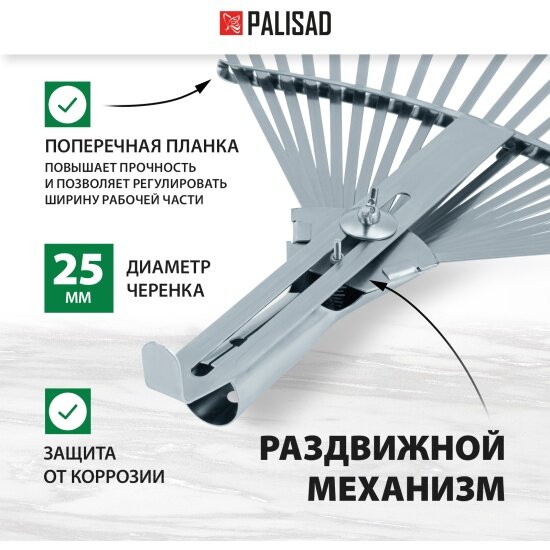 Сервис сравнения цен СкидкаГИД предлагает сравнить цены на товар «Грабли веерные стальные Palisad 22 плоских зуба раздвижные без черенка 300-480 мм (617675)»