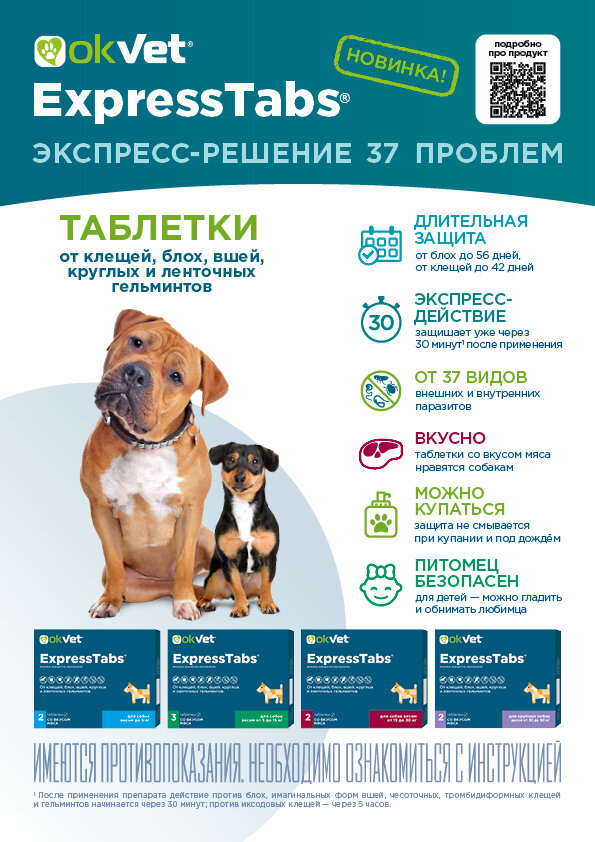 Преимущества: защищает через 30 минут после применения, от 37 видов внешних и внутренних паразитов, защита от блох до 56 дней, от клещей до 42 дней. ЭкспрессТабс® назначают взрослым собакам и щенкам для лечения и профилактики ассоциативных паразитарных заболеваний, вызываемых блохами, иксодовыми клещами, вшами, чесоточными и тромбидиформными клещами, нематодами и цестодами, для профилактики дирофиляриоза, вызываемого личинками Dirofilaria immitis и Dirofilaria repens, а также снижения риска заражения бабезиозом и боррелиозом, переносчиками которых являются иксодовые клещи