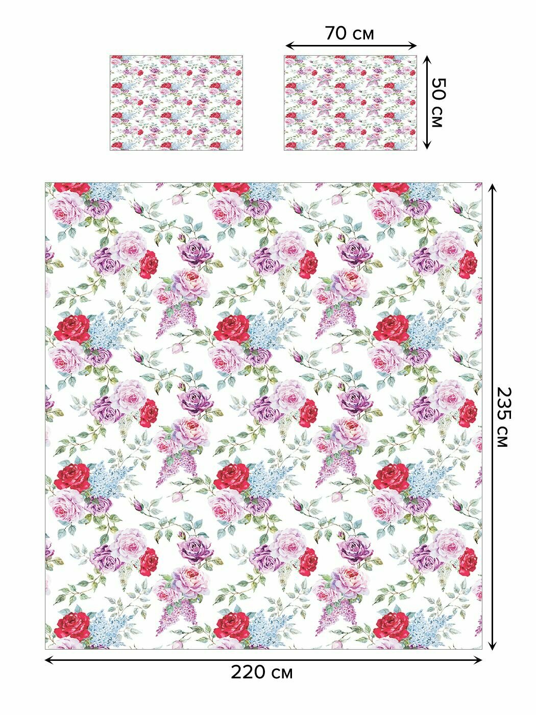 Комплектация: покрывало 220х235 см (2х-спальное), наволочки 50х70 см – 2 шт.