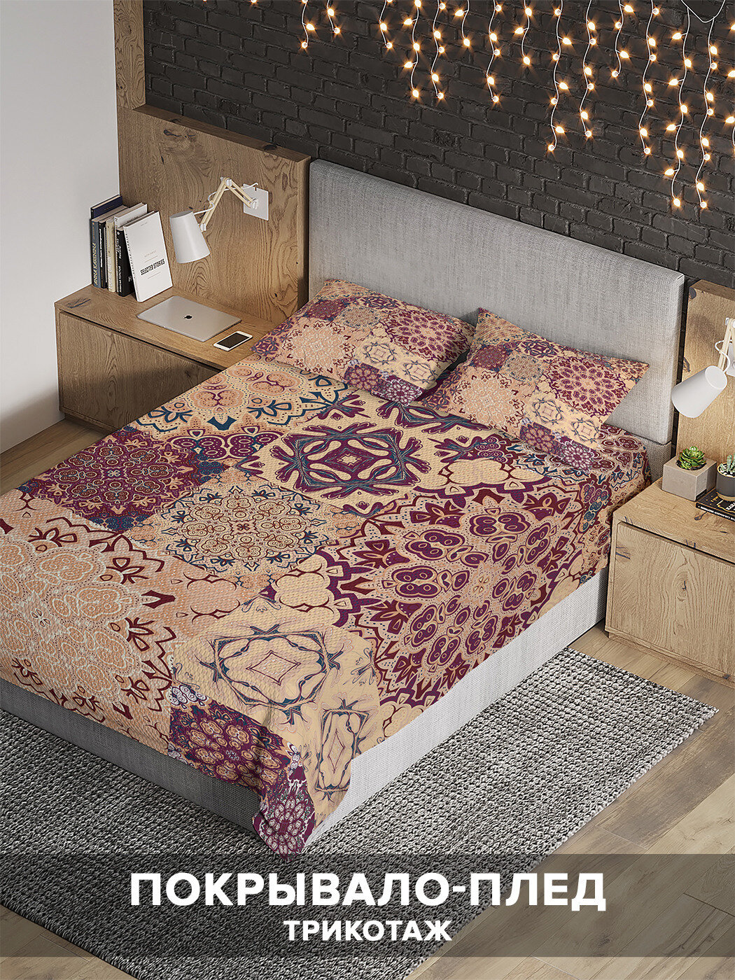 Благодаря используемым материалам, покрывало не мнется, сохраняет форму и хорошо удерживает тепло, что позволяет использовать его в качестве пледа или легкого одеяла. Вы можете создать единый стиль вашей спальни, подобрав шторы с аналогичным принтом. Обращаем внимание, что из-за особенностей производства яркость рисунка может отличаться от изображения на сайте. Допустимо отклонение в размерах полотна в пределах 5 см.