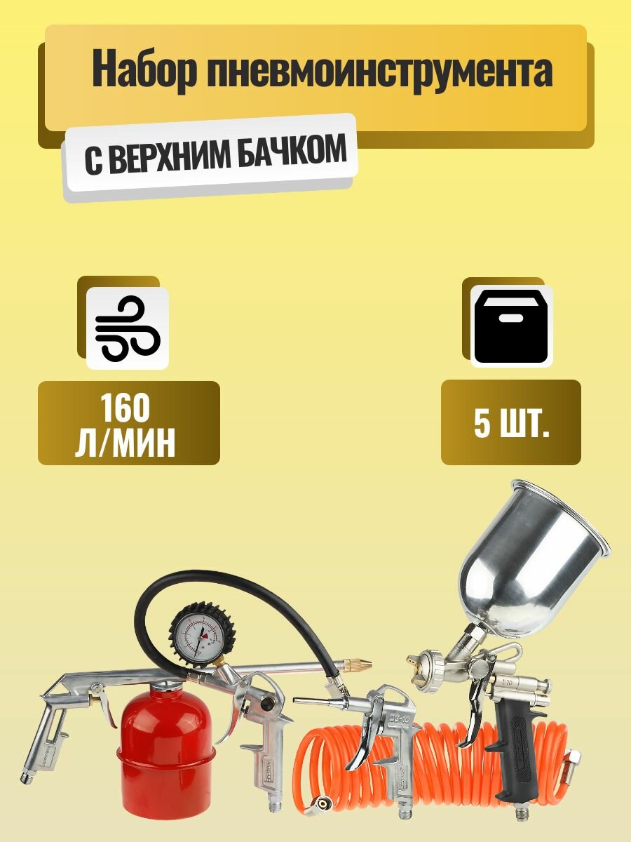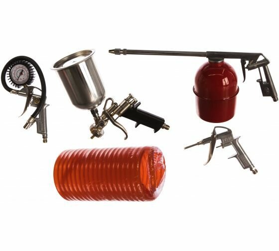 | Состав набора | Краскораспылитель с верхним бачком, Пистолет для нанесения защитных покрытий, Пистолет продувочный, Пистолет для подкачки шин, Пневмошланг спиральный 5 м |