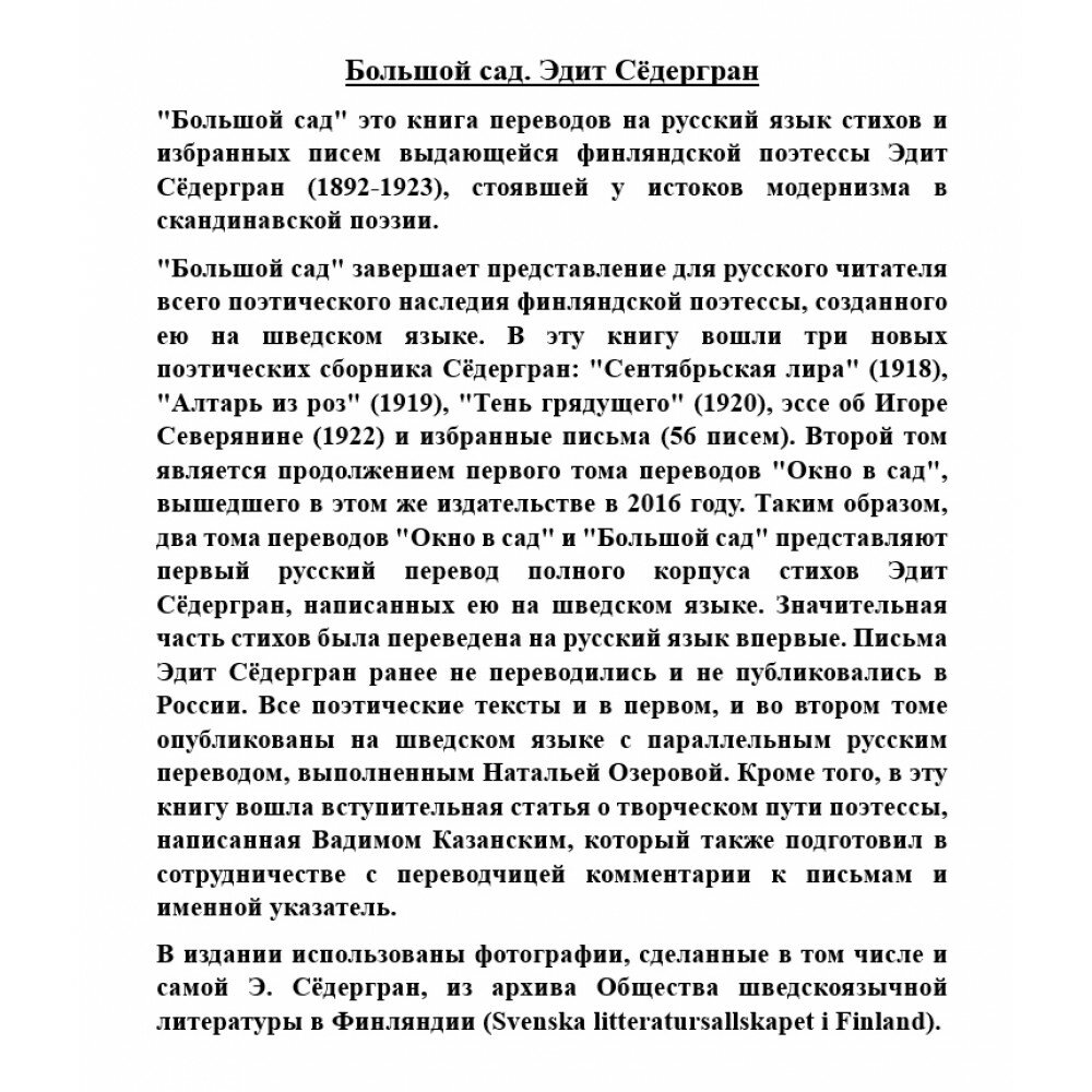 «Большой сад» завершает представление для русского читателя всего поэтического наследия финляндской поэтессы, созданного ею на шведском языке. В эту книгу вошли три новых поэтических сборника Сёдергран: «Сентябрьская лира» (1918), «Алтарь из роз» (1919), «Тень грядущего» (1920), эссе об Игоре Северянине (1922) и избранные письма (56 писем). Второй том является продолжением первого тома переводов «Окно в сад», вышедшего в этом же издательстве в 2016 году. Таким образом, два тома переводов — «Окно в сад» и «Большой сад» — представляют первый русский перевод полного корпуса стихов Эдит Сёдергран, написанных ею на шведском языке. Значительная часть стихов была переведена на русский язык впервые. Письма Эдит Сёдергран ранее не переводились и не публиковались в России. Все поэтические тексты и в первом, и во втором томе опубликованы на шведском языке с параллельным русским переводом, выполненным Натальей Озеровой. Кроме того, в эту книгу вошла вступительная статья о творческом пути поэтессы, написанная Вадимом Казанским, который также подготовил в сотрудничестве с переводчицей комментарии к письмам и именной указатель.