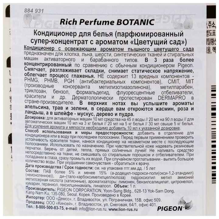 Концентрированный кондиционер Pigeon для одежды белья с ароматом белых цветов 1000мл