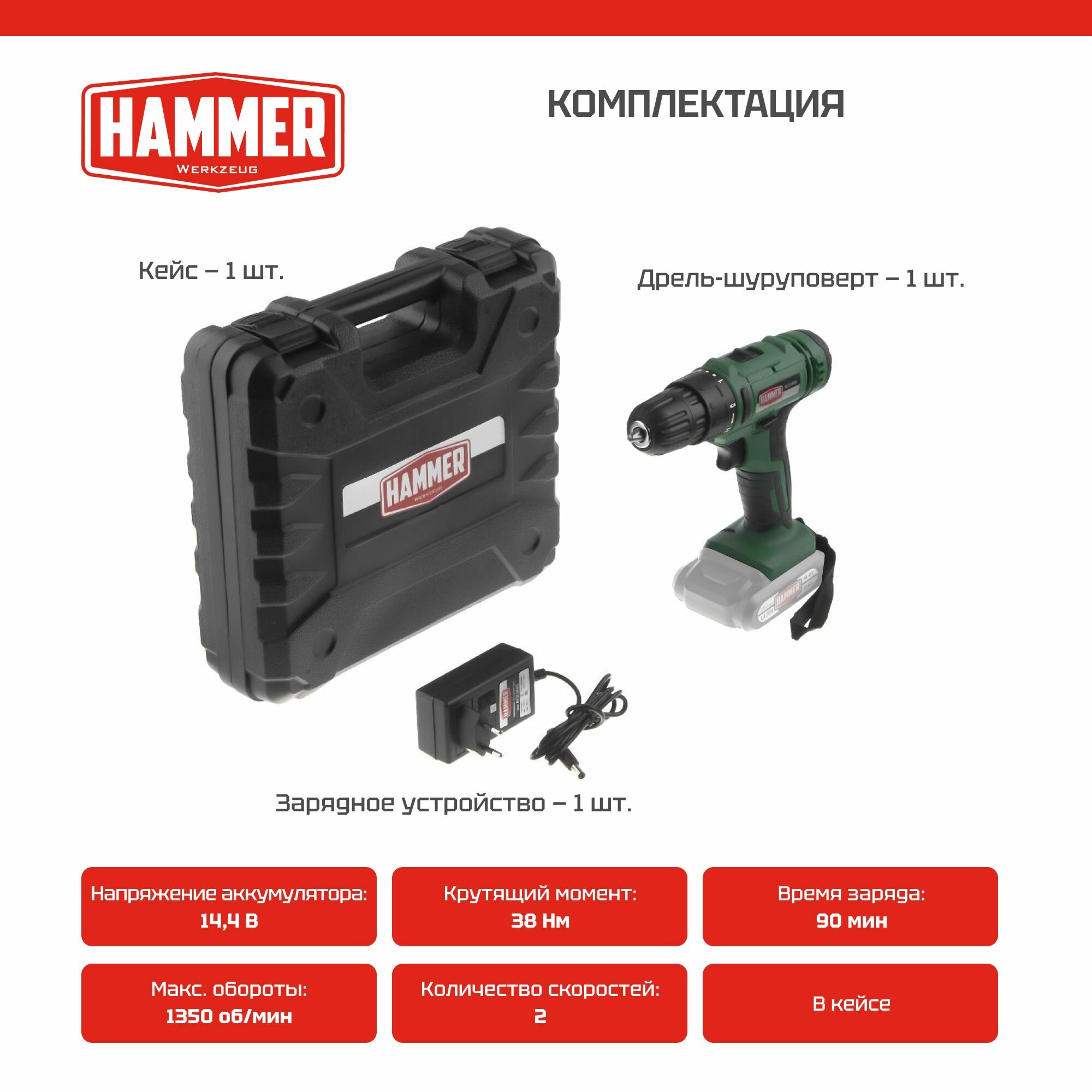 дрель-шуруповерт HAMMER ACD14BS 144В Li-Ion 2Ач 2 аккумулятора