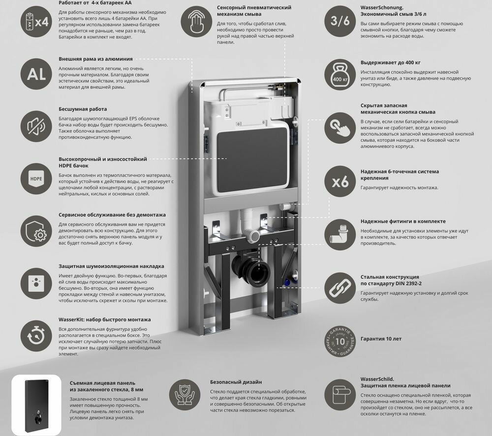 | Комплектация | фитинги для подачи и слива воды, защитная шумоизоляционная накладка, крепления для унитаза, WasserKit, эксцентриковая дренажная труба, инструкция, упаковка |