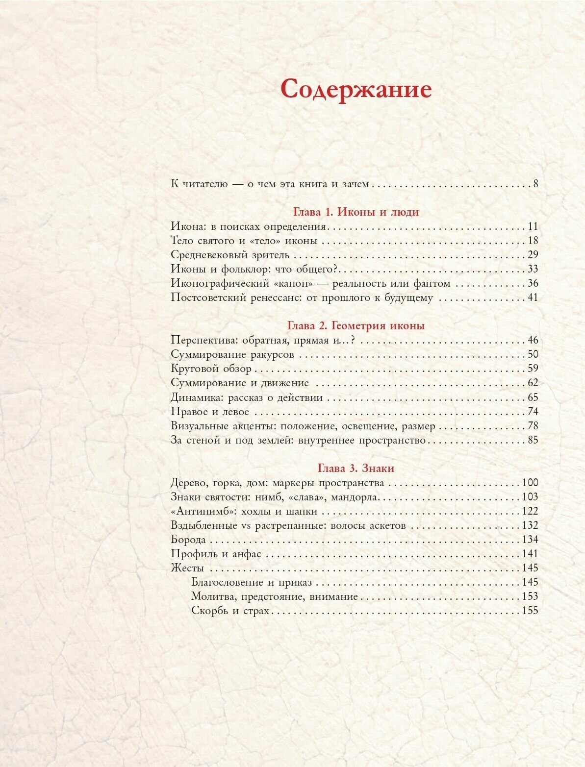 Первая глава знакомит читателя с историей иконопочитания – от эпохи раннего христианства до сегодняшних дней. Во второй описаны геометрические принципы, которые позволяют иконописцам рассказывать о пространстве и об изображаемых предметах. В следующих главах речь идет о знаках – малозаметных элементах, из которых строится любой визуальный рассказ, и о мотивах, повторяющихся в разных композициях. Автор рассматривает необычные вариации некоторых сюжетов. Наконец, последняя глава рассказывает о любопытных курьезах и популярных легендах, связанных с иконами.