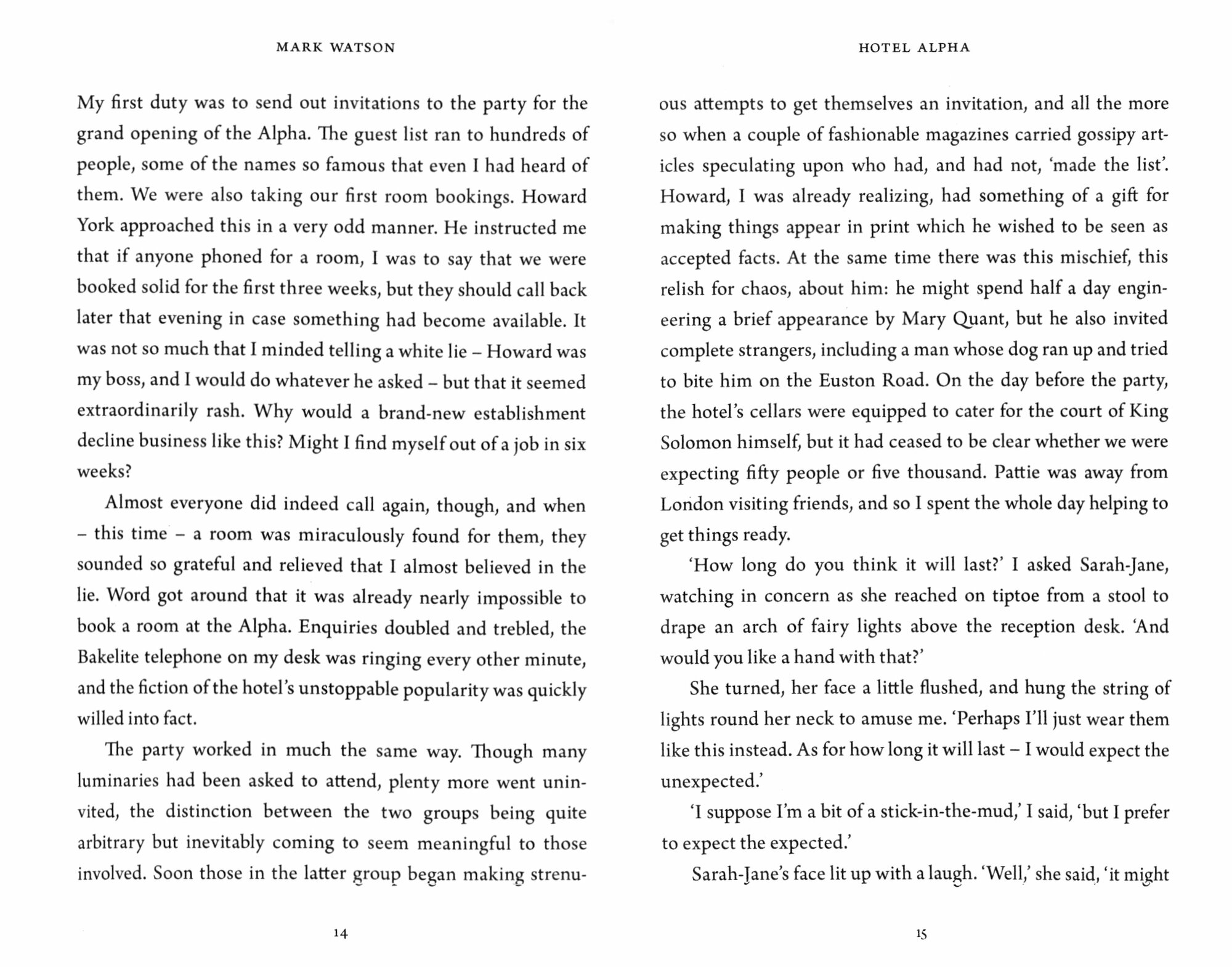 Howard York - self-made man and founder of London's extraordinary Hotel Alpha - is one of those people who makes you feel that anything is possible. He is idolized by his blind adopted son, Chas, and Graham, the inimitable concierge, whose lives revolve around the Alpha. But when two mysterious disappearances raise questions that no one seems willing to answer, Chas and Graham must ask themselves whether Howard's vision of the perfect hotel has been built on secrets as well as dreams...