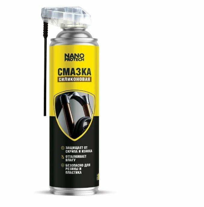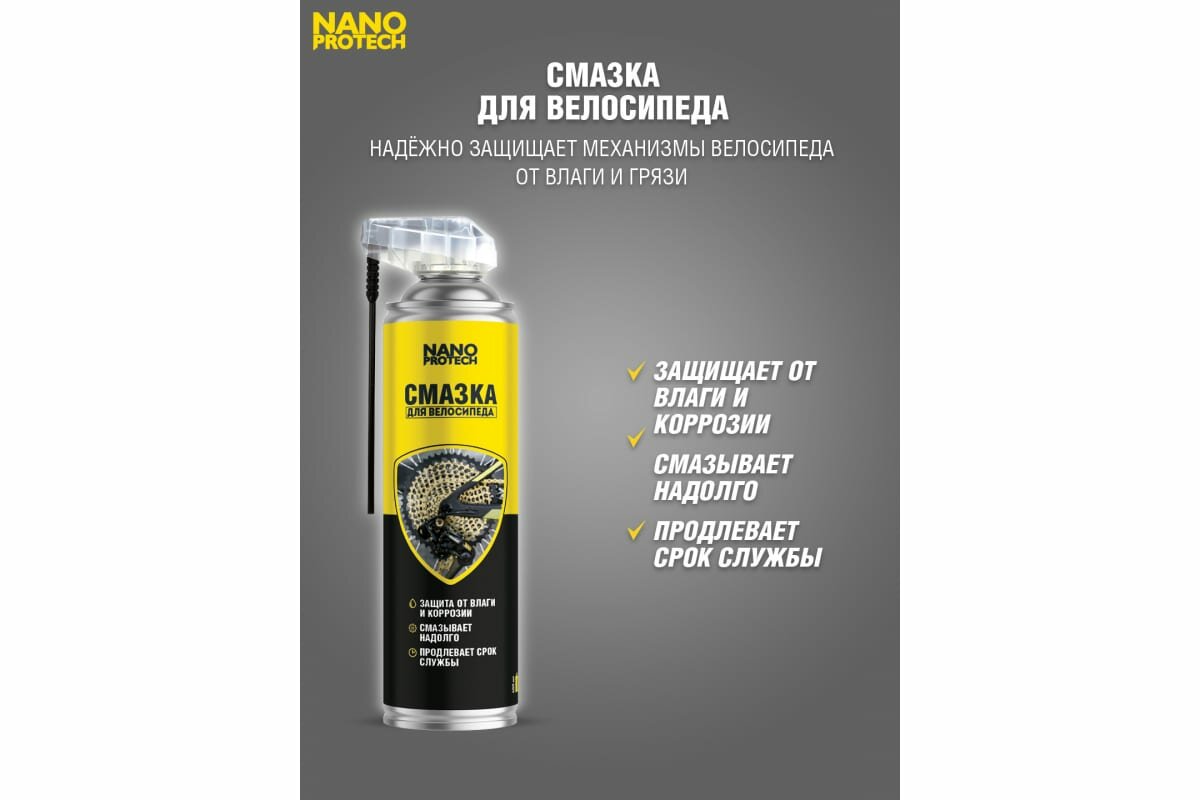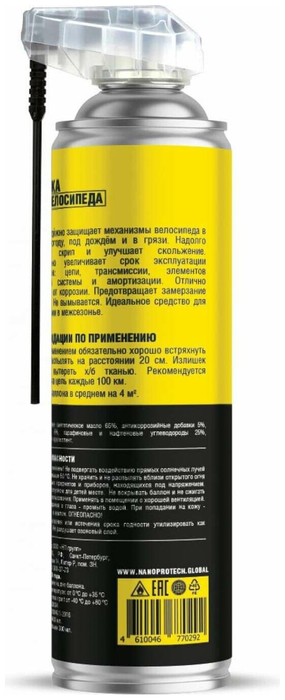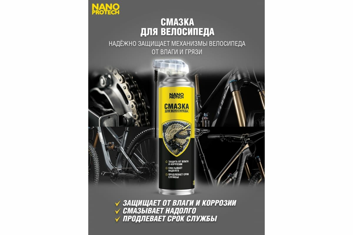 Смазка для велосипеда NANOPROTECH, надёжно защищает механизмы велосипеда в мокрую погоду, под дождём и в грязи. Надолго исключает скрип и улучшает скольжение. Значительно увеличивает срок эксплуатации механизмов: цепи, трансмиссии, элементов тормозной системы и амортизации. Отлично защищает от коррозии. Предотвращает замерзание до -40°С. Не вымывается. Идеальное средство для консервации в межсезонье. РЕКОМЕНДАЦИИ ПО ПРИМЕНЕНИЮ Перед применением обязательно хорошо встряхнуть баллон, распылять на расстоянии 20 см. Излишек средства вытереть х/б тканью. Рекомендуется наносить на цепь каждые 100 км. Расход 1 баллона в среднем на 4 кв.м. СОСТАВ Высокоочищенное синтетическое масло 65%, антикоррозийные добавки 5%, антиоксиданты 5%, парафиновые и нафтеновые углеводороды 25%, углеводородный пропеллент. СРОК ГОДНОСТИ И ХРАНЕНИЕ Гарантийный срок хранения 3 года со дня изготовления. Хранить при температуре: от 5?С до +35?С МЕРЫ БЕЗОПАСНОСТИ Не обрабатывать тормозные диски и колодки! Баллон под давлением! Не подвергать воздействию прямых солнечных лучей и нагреванию свыше +50°С. Не хранить и не распылять вблизи открытого огня или раскалённых предметов и приборов, находящихся под напряжением. Хранить в недоступном для детей месте. Не вскрывать баллон и не сжигать даже после использования. В случае попадания в глаза или на кожу промыть водой. Огнеопасно! После использования или истечения срока годности утилизировать как бытовой отход. Не разрушает озоновый слой.