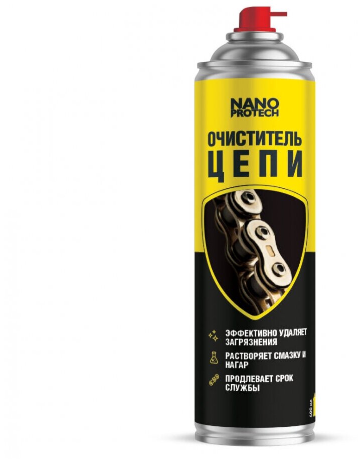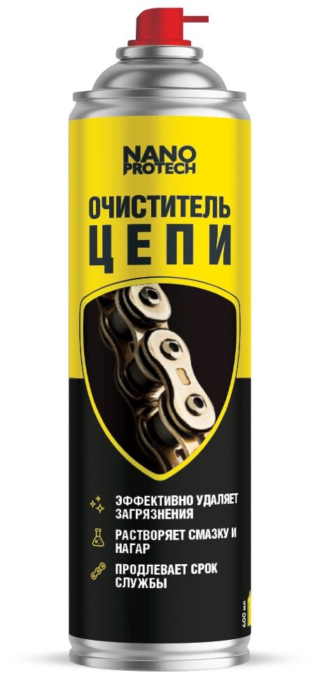 Очиститель цепи NANOPROTECH, на основе комбинации растворителей обеспечивает быструю и эффективную очистку и обезжиривание цепей. Без остатка удаляет нагар, масляные, жировые и прочие технические загрязнения. Специально разработан для очистки цепей мотоциклов, велосипедов, мотороллеров, мопедов, а также цепи двигателя автомобиля. Подходит для цепей с кольцеобразными звеньями, для цепей с сальниками круглого и х-образного сечения, а также без сальников. Продлевает срок службы оборудования. Не требует демонтажа узлов. РЕКОМЕНДАЦИИ ПО ПРИМЕНЕНИЮ Обязательно встряхнуть баллон и распылить средство на поверхность цепи. Дать средству полностью испариться. Рекомендуется протереть сухой ветошью. При необходимости повторить обработку. СОСТАВ Алифатические углеводороды