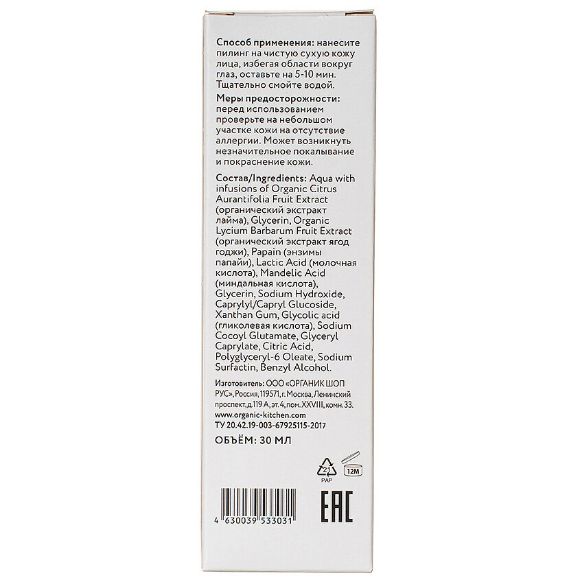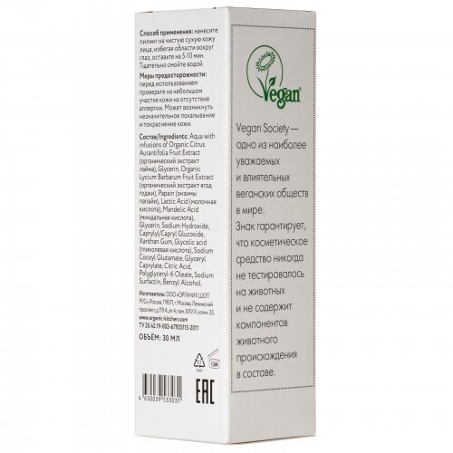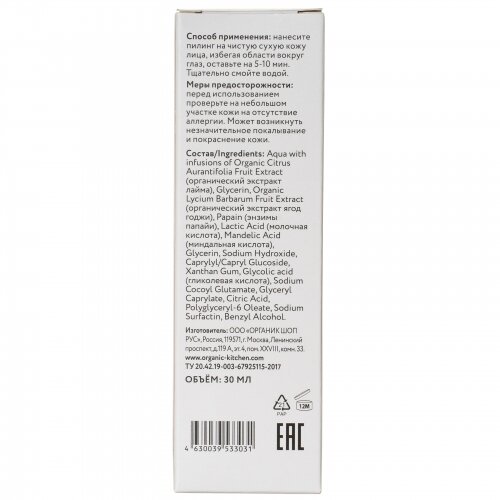 | Способ применения | Нанесите пилинг на чистую сухую кожу лица, избегая области вокруг глаз, оставьте на 5-10 мин. Тщательно смойте водой.Меры предосторожности |