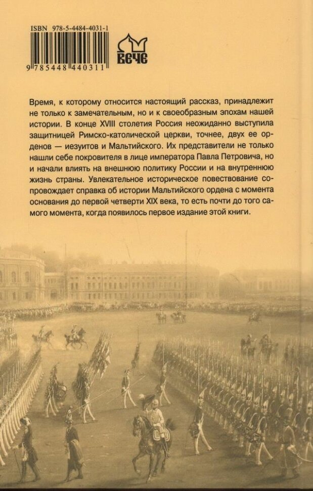 Время, к которому относится настоящий рассказ, принадлежит не только к замечательным, но и к своеобразным эпохам нашей истории. В конце XVIII столетия Россия неожиданно выступила защитницей римско-католической церкви, точнее, двух ее орденов — иезуитов и Мальтийского. Их представители не только нашли себе покровителя в лице императора Павла Петровича, но и начали влиять на внешнюю политику России и на внутреннюю жизнь страны. Увлекательное историческое повествование сопровождает справка об истории Мальтийского ордена с момента основания до первой четверти XIX века, то есть почти до того самого момента, когда появилось первое издание этой книги.