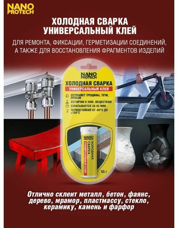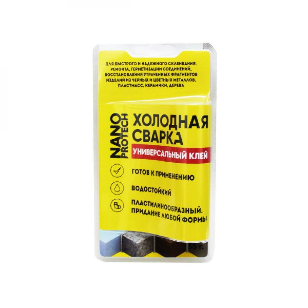 Холодная сварка - Универсальный клей NANOPROTECH, универсальный клей, на подобии пластилина, предназначен для ремонта, фиксации, герметизации соединений, а также для восстановления утраченных фрагментов изделий. Отлично склеит: металл, бетон, фаянс, дерево, мрамор, пластмассу, стекло, керамику, камень, фарфор. Готовый состав устойчив к перепадам температур, химическим реагентам. После высыхания состав можно подвергать механической обработке (сверлить, шкурить). Укрепляет соединения труб и сантехнических соединений, устраняет течи, надёжно соединяет материалы, фурнитуру, ремонтирует авто детали, спортивный инвентарь, садовый инструмент, кухонную утварь. РЕКОМЕНДАЦИИ ПО ПРИМЕНЕНИЮ 1. Поверхности очистить от грязи и ржавчины, зачистить крупнозернистой наждачной бумагой, обезжирить и просушить. 2. Отрезать не менее 1/3 от объёма стержня и тщательно смешать оба компонента пальцами рук (можно влажными) до получения равномерной окраски массы. 3. Полученную смесь нанести на ремонтируемую поверхность. При склеивании деталей нанести пластилин на обе соединяемые поверхности, прижать и зафиксировать на 15 минут. 4. На влажных и масляных поверхностях смесь необходимо приглаживать до момента прилипания к поверхности (на масляных поверхностях прочность соединения снижается на 20%). 5. Для разглаживания ремонтируемой поверхности и придания ей необходимой формы используйте плоские предметы, смоченные водой. 6. После высыхания состава (через 2,5 часа) соединение можно подвергать механической обработке (зашкурить) и нагрузке, при необходимости покрасить. СОСТАВ Эпоксидно-диановая смола до 20%, аминный отвердитель до 8%, пластификатор до 1%, ускоритель отвердения до 0,1%, каолин до 10%, мел до 50%, диоксид кремния до 2%, железный порошок до 10%. СРОК ГОДНОСТИ И ХРАНЕНИЕ Хранить в сухом, темном месте при температуре не выше +35 °С. Утилизировать как бытовой мусор. Срок годности 18 месяцев. Если в результате хранения или резких колебаний температур произошло отвердение внешнего слоя состава – нагрейте холодную сварку до +60°С. Можно использовать для этого горячую воду, положить на батарею или верхнюю крышку двигателя автомобиля - на 10 мин. МЕРЫ БЕЗОПАСНОСТИ Не допускать попадания компонентов стержня в глаза. Рекомендуется использовать защитные перчатки. При попадании в глаза промыть их водой и обратиться к врачу. Не использовать на поверхностях, контактирующих с продуктами питания. Беречь от детей.
