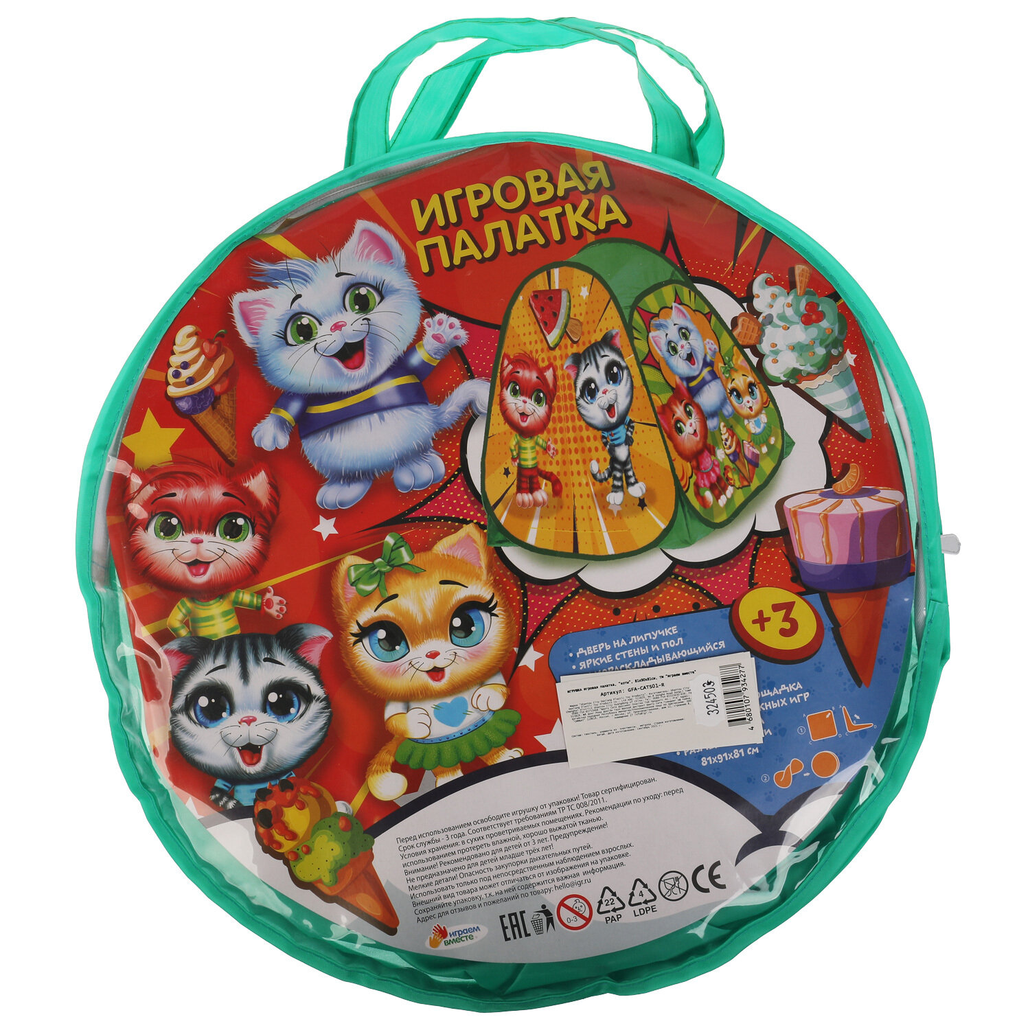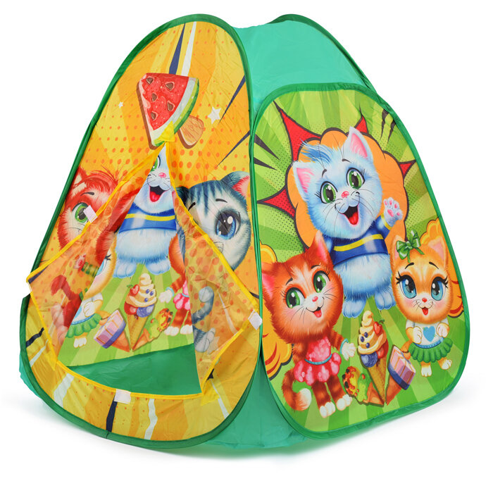 Малыш с удовольствием будет играть в этой яркой палатке в виде шатра с изображением очаровательных котиков. Палатка быстро собирается и разбирается, к тому же очень компактна в собранном виде, поэтому её можно взять с собой на дачу или на пикник.