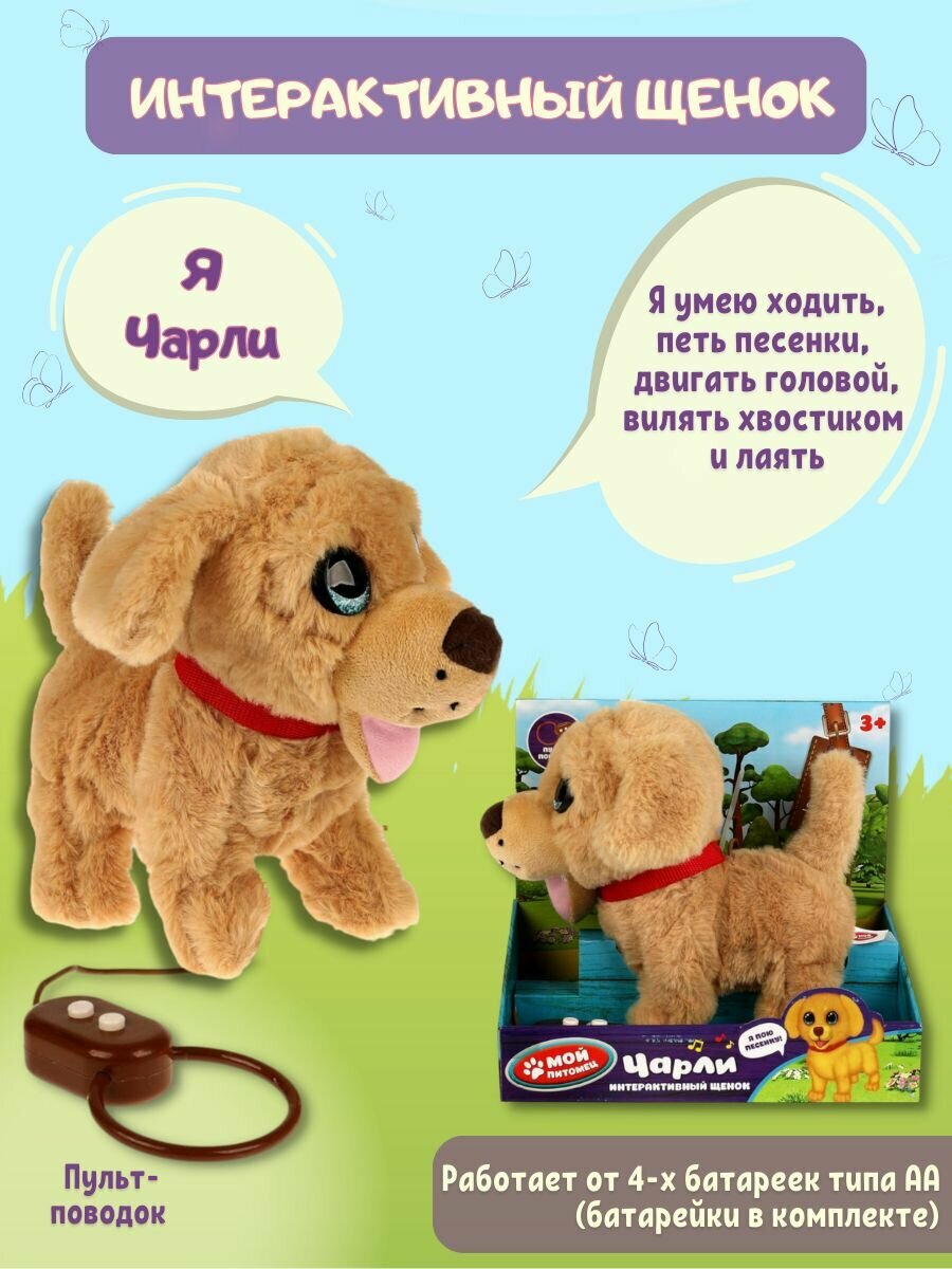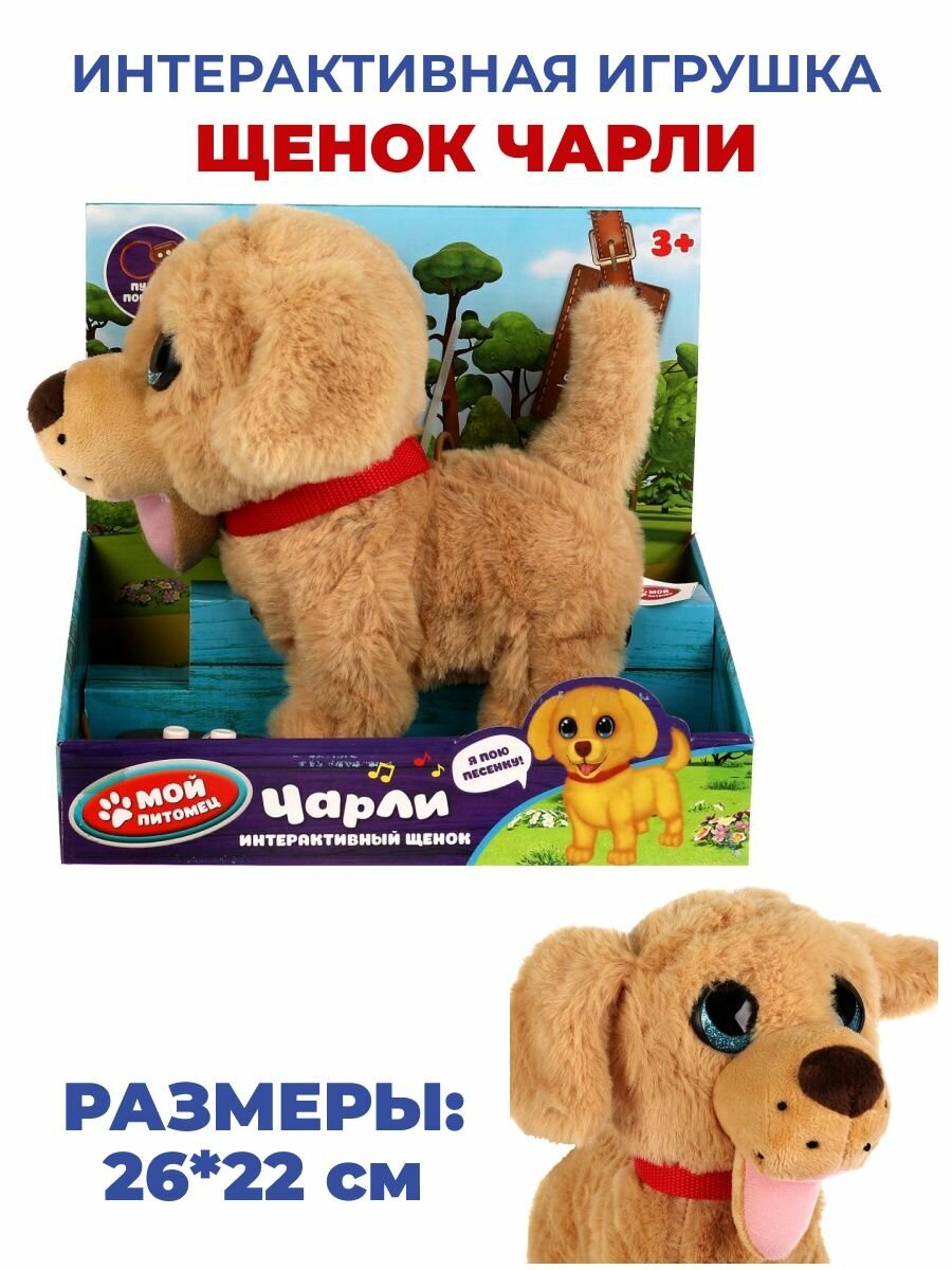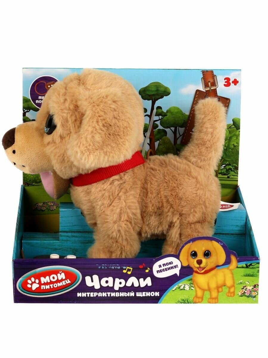 Этот очаровательный щенок совсем как настоящий. У Чарли красивые глазки и умилительная мордочка. Бежевая шёрстка щенка очень приятная на ощупь. На Чарли надет стильный красный ошейник. Милая игрушка подарит малышу массу положительных эмоций и научит заботиться о домашнем любимице.