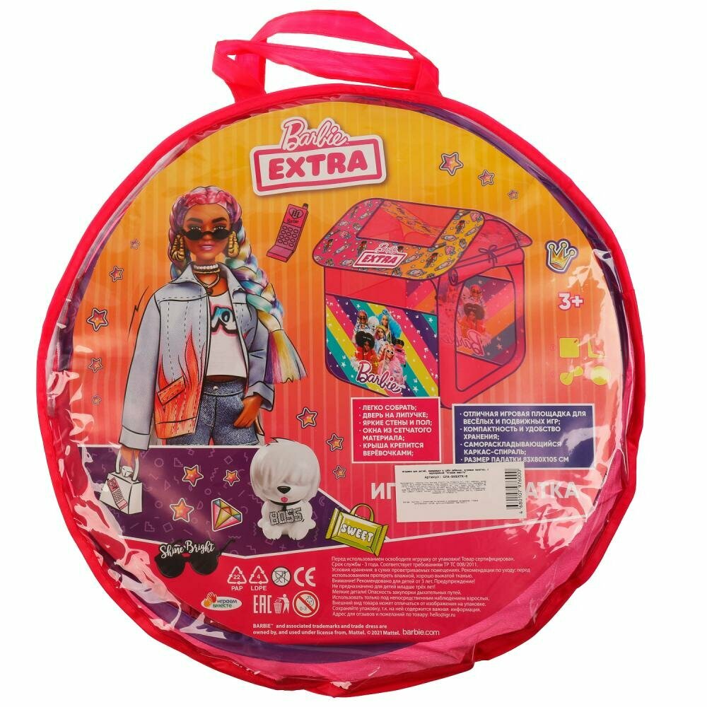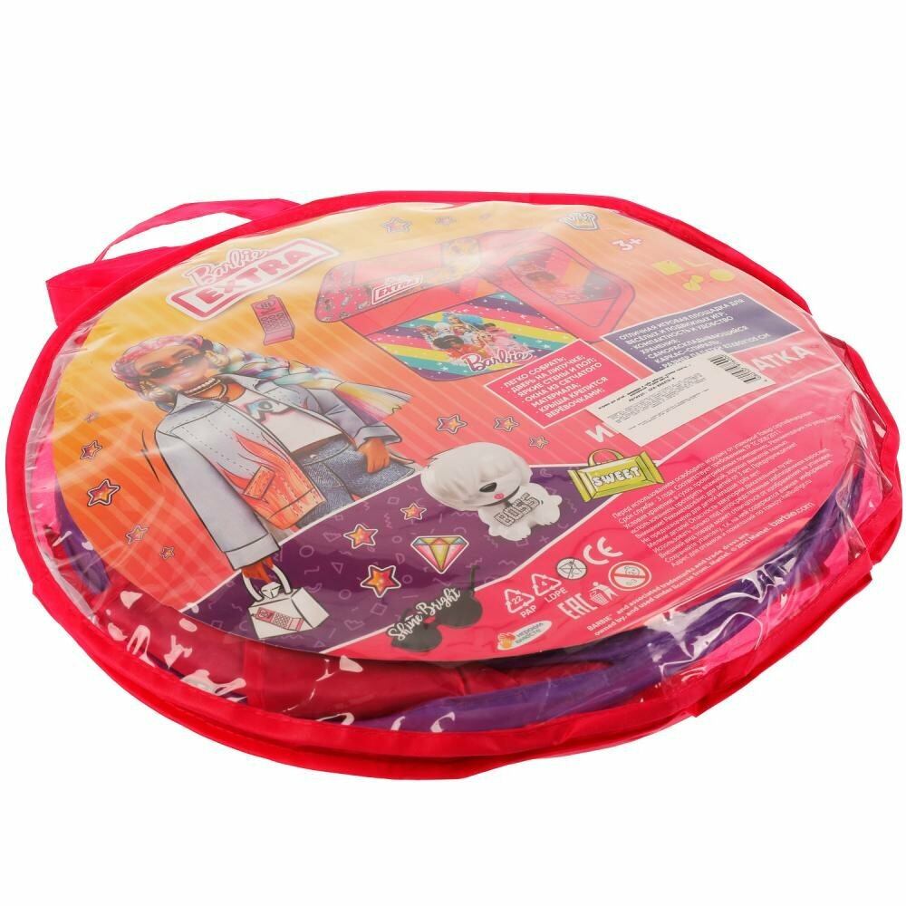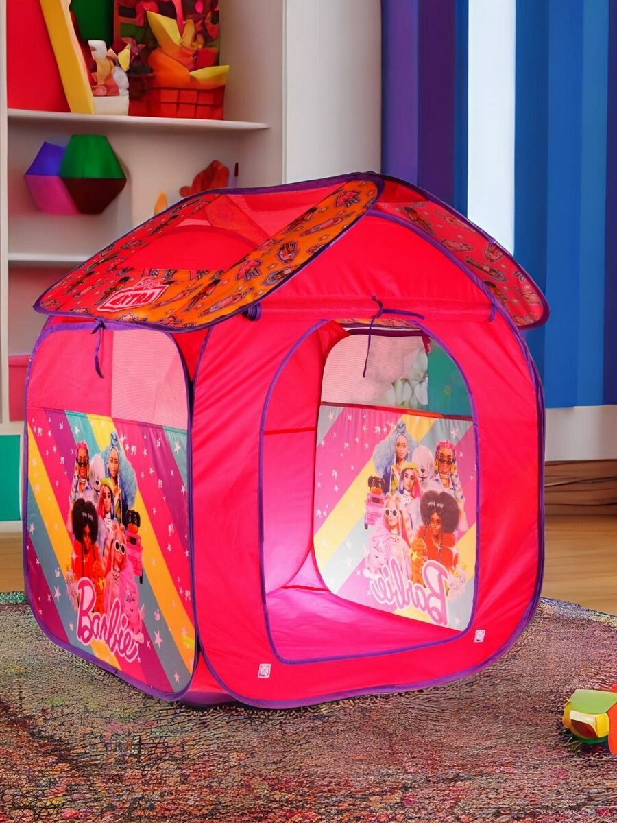 Малыш с удовольствием будет играть в этой яркой палатке, сделанной в виде домика и украшенной изображением очаровательных кукол Барби. Палатка быстро собирается и разбирается, она очень компактна в собранном виде, поэтому её можно взять с собой на дачу или пикник.