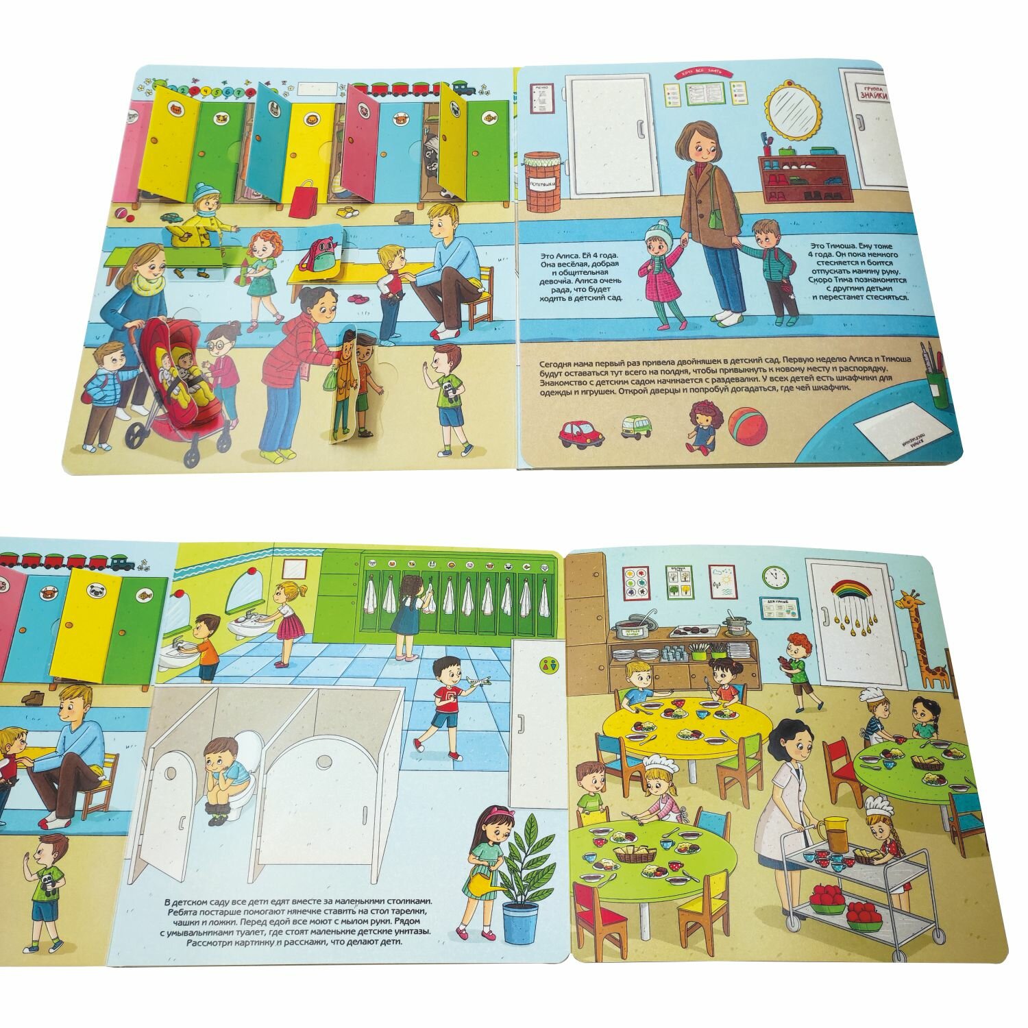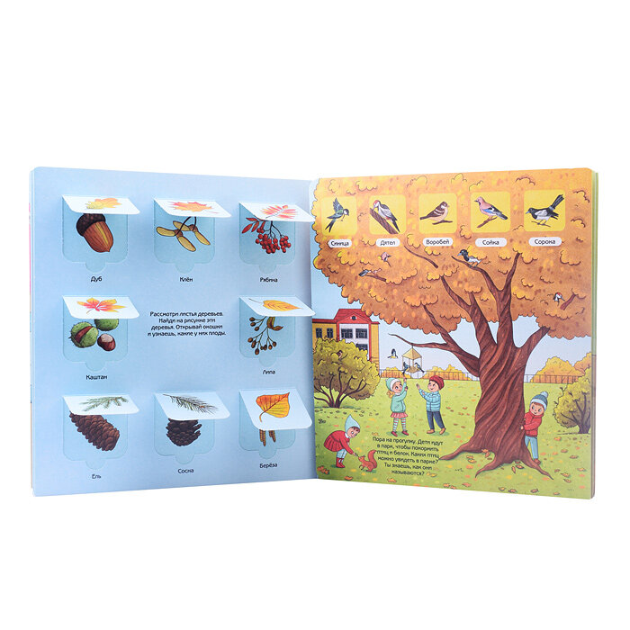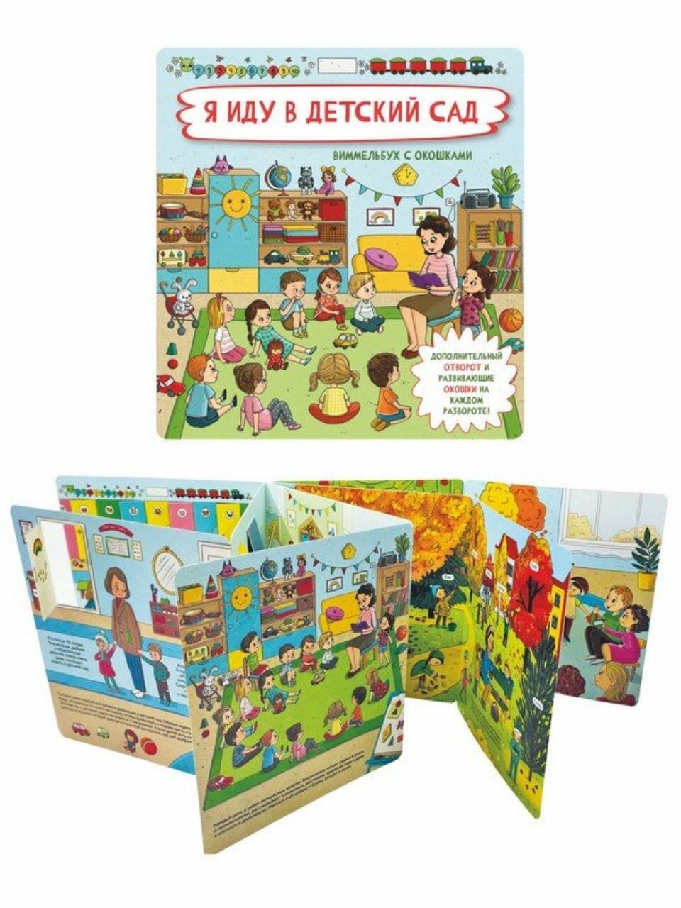 Книга представляет собой виммельбух с окошками и заданиями.
