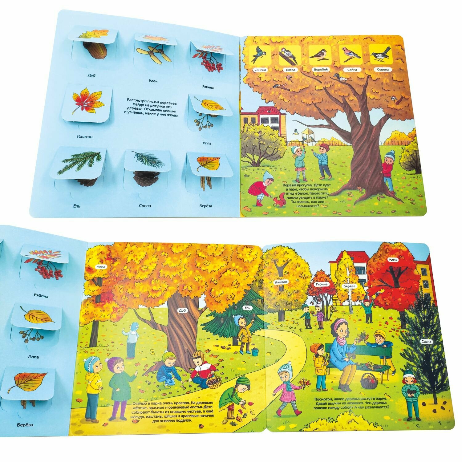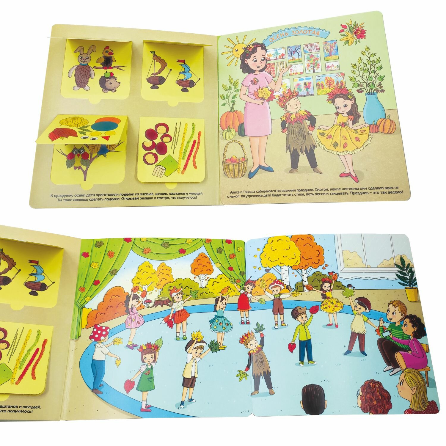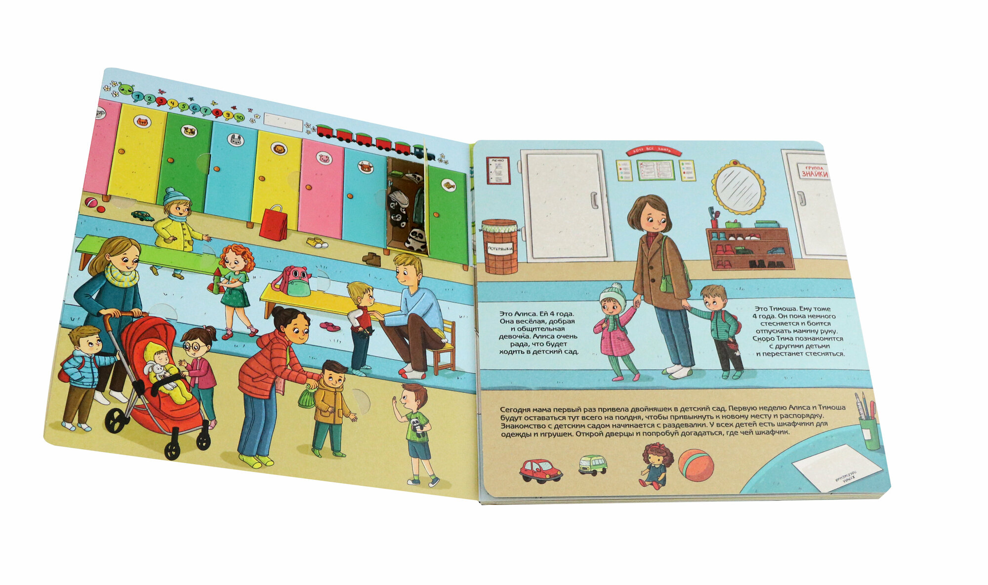 Книга представляет собой виммельбух с окошками и заданиями.