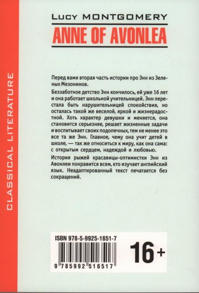 После просмотра фильма \"Энн с двумя нн\" решила купить данную книгу и прочитать. Осталась я очень довольна. Несмотря на то,что я не знаю английский в идеале,вся книга была для меня понятной. Читалось легко и непринужденно. Сюжет захватывающий. Ни разу не пожалела, что приобрела ее. Обложка тоже порадовала. Очень яркая,красивая. Бумага качественная,нет ощущения \"газетных страниц\". Подруга,увидев ее,захотела тоже прочитать,поэтому вскоре закажу такую же для нее
