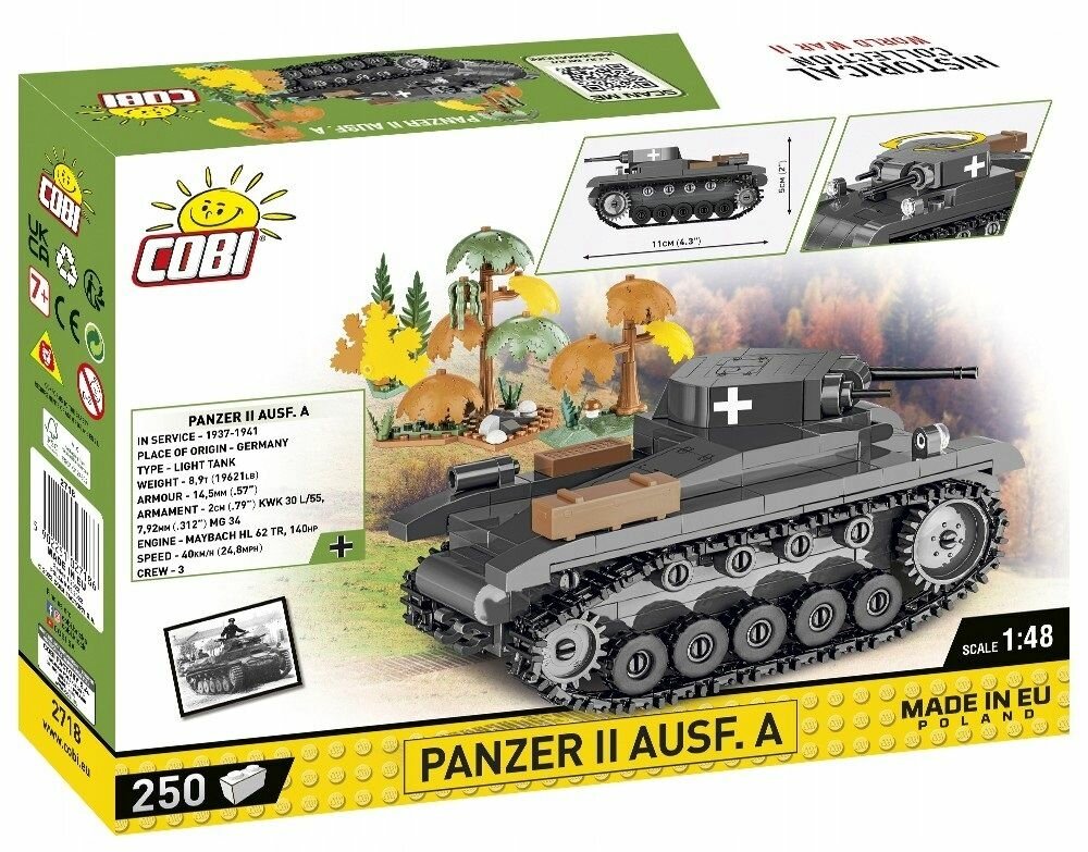 Конструктор Cobi Немецкий танк Panzer II Ausf. A арт. 2718 развивает творческое мышление, усидчивость и мелкую моторику. Выполнен из безопасных для здоровья материалов. Panzerkampfwagen II — немецкий лёгкий танк, использовавшийся в первые годы Второй мировой войны. До 1941 года являлся основным танком танковых дивизий. С 1942 г. из-за слабости вооружения утратил свое значение. Он использовался для разведывательных и противоповстанческих задач. Было создано около дюжины версий PzKpfw II. Их применяли до окончания боевых действий на всех фронтах. Миниатюрный автомобиль из конструктора COBI был изготовлен в совершенно новом мас шт.абе 1:48.