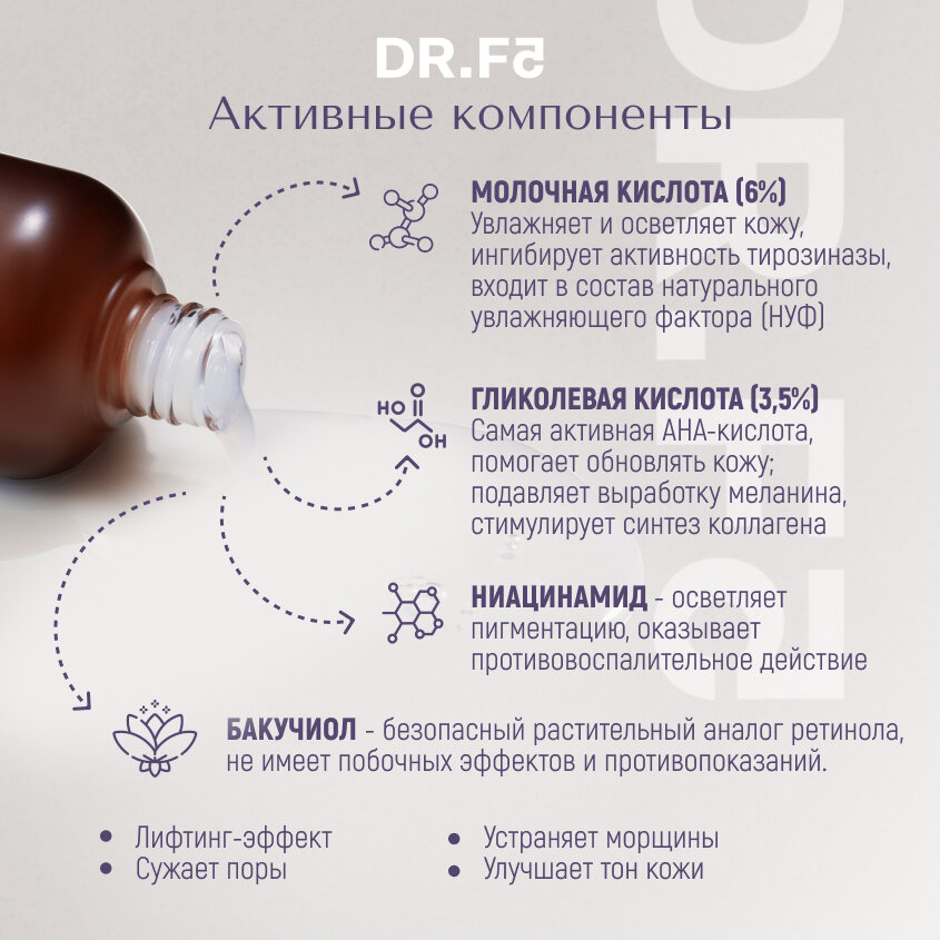 | Состав | Water, lactic acid, propanediol, jojoba esters, glycolic acid, potassium hydroxide, 1,2-hexanediol, niacinamide, sodium citrate, citric acid, psoralea corylifolia fruitextract, carthamus tinctorius (safflower) seed oil, vitis vinifera (grape) seed oil, limnanthes alba (meadowfoam) seed oil, argania spinosa kernel oil, helianthusannuus (sunflower) seed oil, epilobium angustifolium flower/leaf/stem extract, melia azadirachta flower extract, ocimum sanctum leaf extract, melia azadirachta leafextract, psidium guajava fruit extract, psidium guajava leaf extract, allium sativum (garlic) bulb extract, luffa cylindrica fruit extract, curcuma longa (turmeric) rootextract, camellia sinensis leaf extract, corallina officinalis extract, lactobacillus ferment, dipotassium glycyrrhizate, collagen, cholesterol, ceramide np, allantoin, lecithin, tocopherol, butylene glycol, cetearyl alcohol, polyglyceryl-10 stearate, polyacrylate crosspolymer-6, arachidyl alcohol, behenyl alcohol, sclerotium gum, arachidyl glucoside, protease, adenosine, t-butyl alcohol, arginine, fragrance |