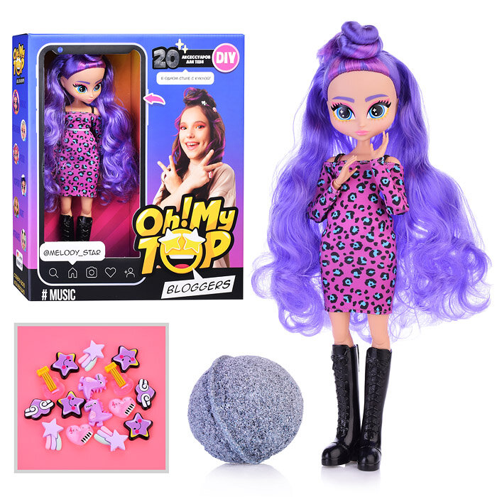 Oh! My TOP – линейка стильных и модных кукол блогеров! Каждая из них занимается любимым делом: танцы, музыка, искусство, путешествия, сладости и мода! Уникальный набор шарнирных кукол с DIY украшениями! Ребенок сможет самостоятельно сделать себе украшения из шармов, добавить яркости с помощью мелков для волос, декорировать различные поверхности стикерами. В каждом наборе есть сюрприз – пенная бомбочка с секретным питомцем внутри! Увлекательный процесс распаковки!