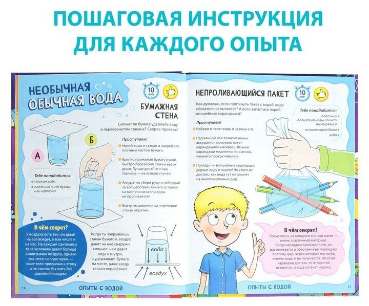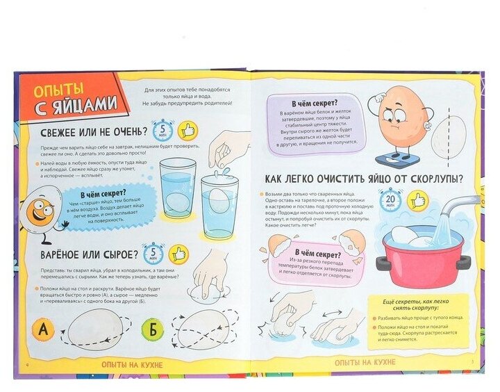 У каждого опыта указано время его выполнения, дана пошаговая инструкция, а также возможность самостоятельного выполнения или при помощи взрослых.