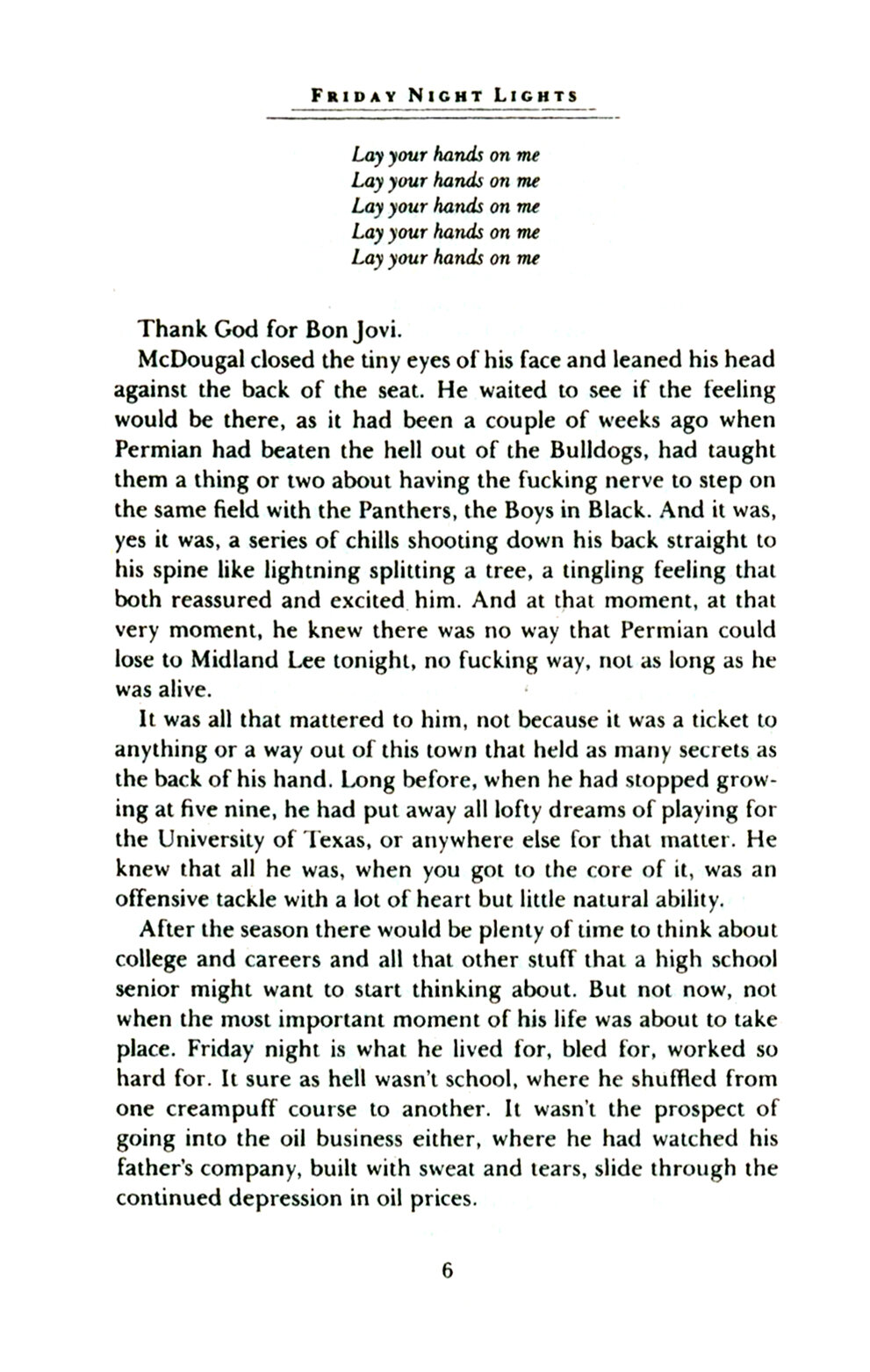 In 1988 H.G. Bissinger spent a season in Odessa discovering just what makes a town pin its hopes on eleven boys on a football field. He lived with the students, coaches and townspeople who dedicate their lives to their team, sharing their joys and triumphs, their pains, injuries and bitter disappointments. He returned with a compassionate but hard-eyed story of a town riven by money, race and class, where a high school can spend more on medical supplies for its athletic program than on its English department.