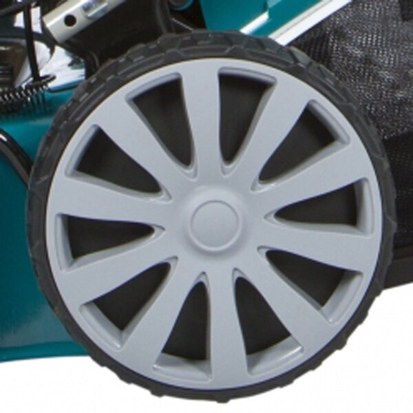 Самоходная модель движется по участку самостоятельно, но нужно следить за направлением. Для ее запуска предусмотрен ручной стартер со шнуром. Встроенная антивибрационная система снижает уровень шума. Газонокосилка корейского производства включает: