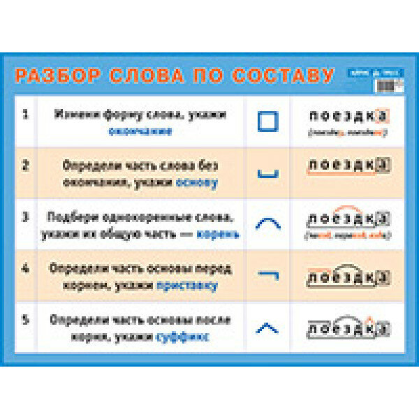 На красочно оформленном плакате в доступной форме представлен алгоритм разбора слова по составу. Предлагаемый плакат является самостоятельной частью Комплекта наглядных пособий по русскому языку для начальной школы. Это пособие универсально и может быть использовано как необходимое дополнение ко всем существующим сегодня курсам русского языка в начальной ступени образования.
