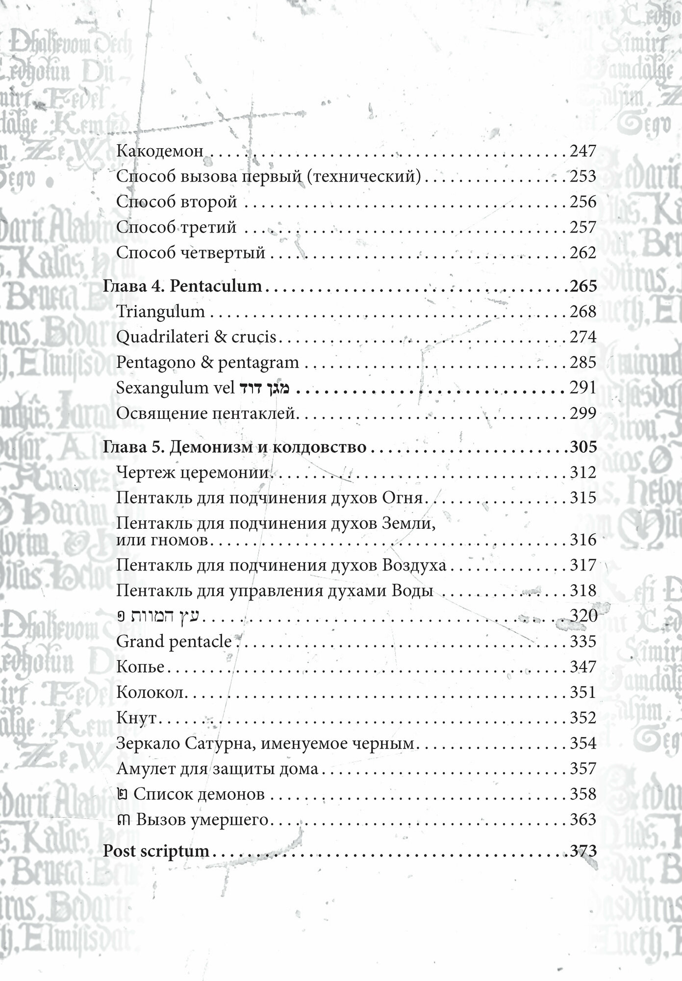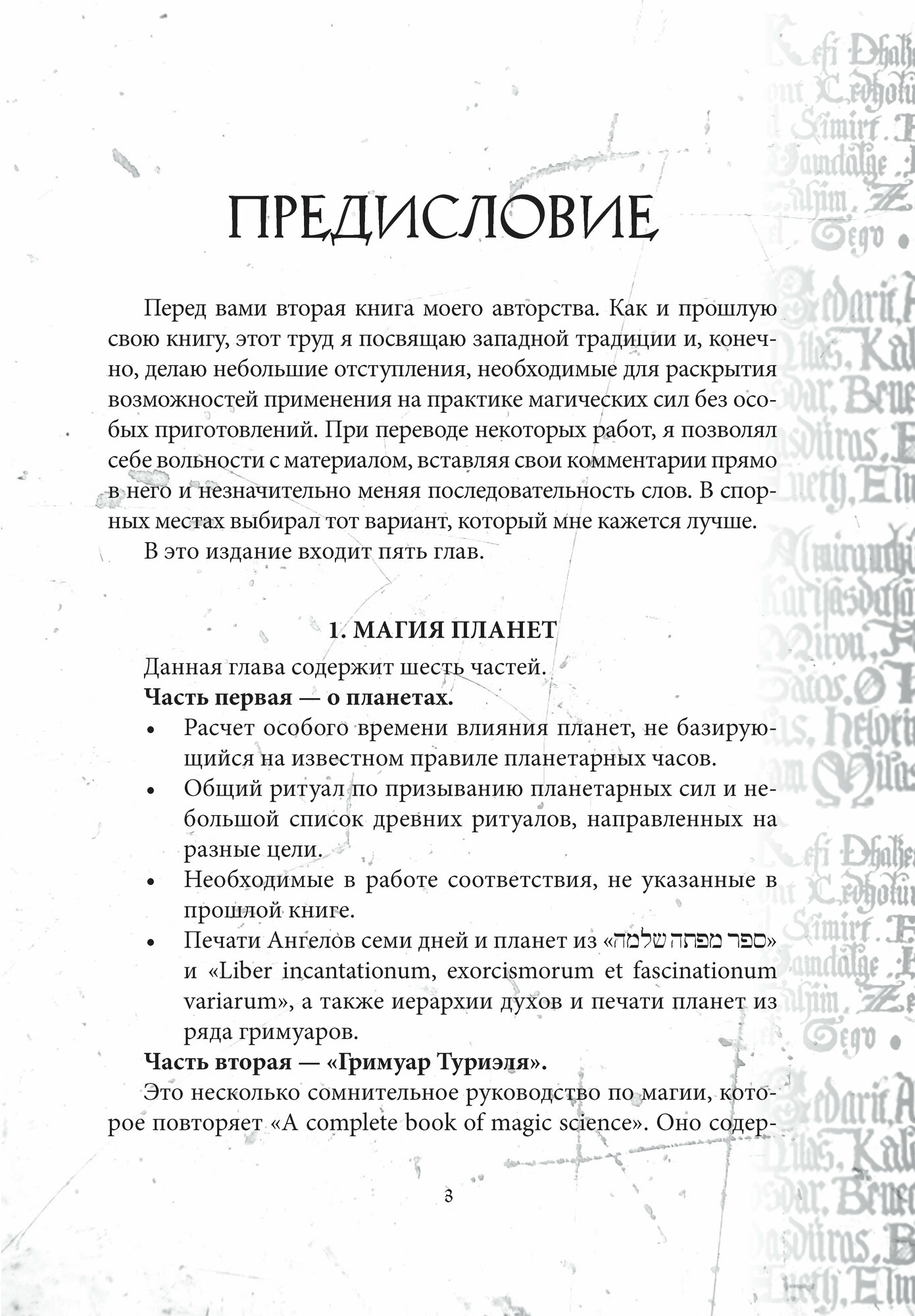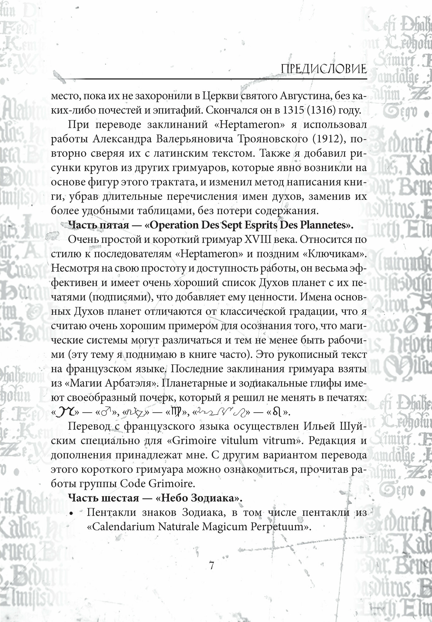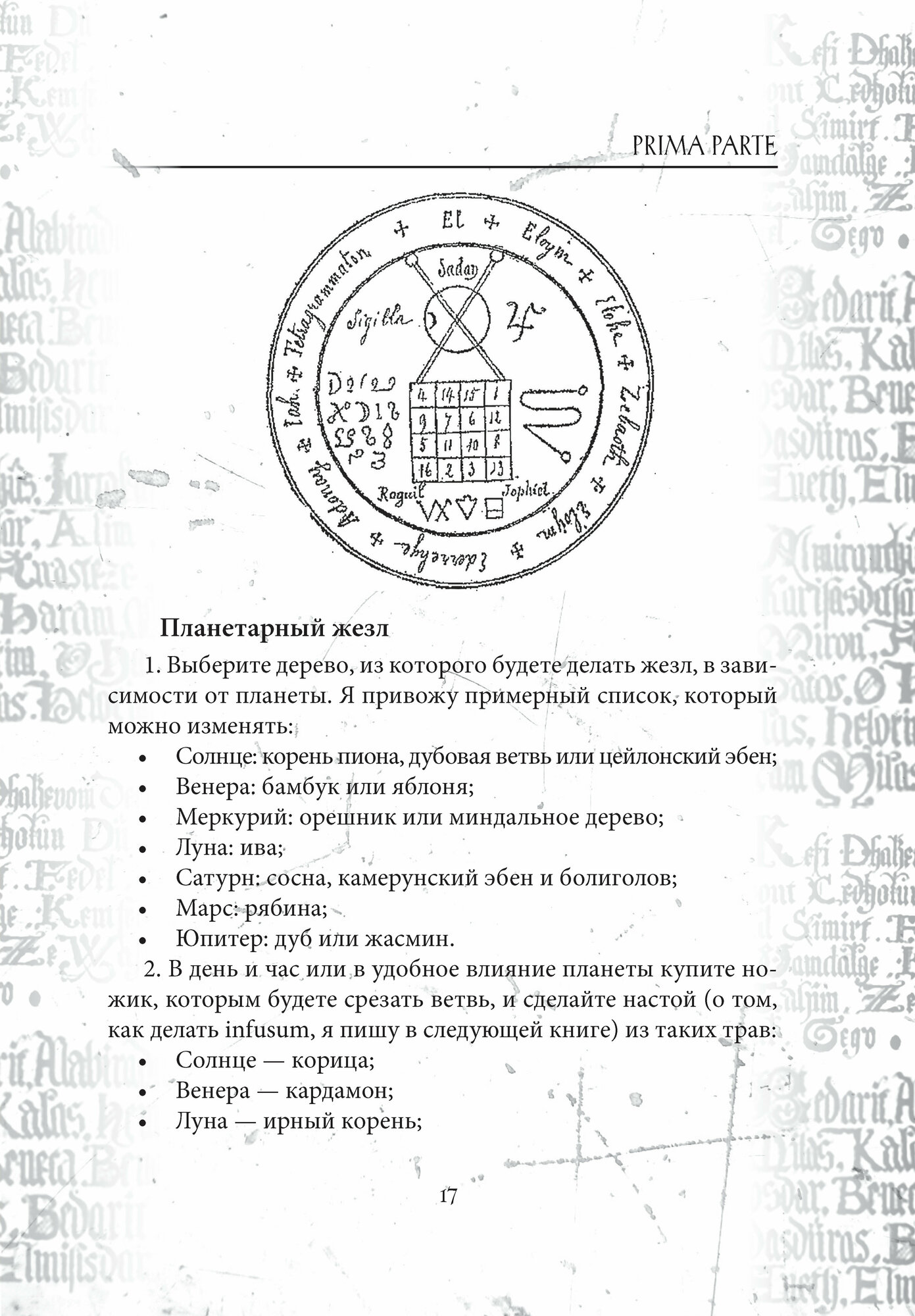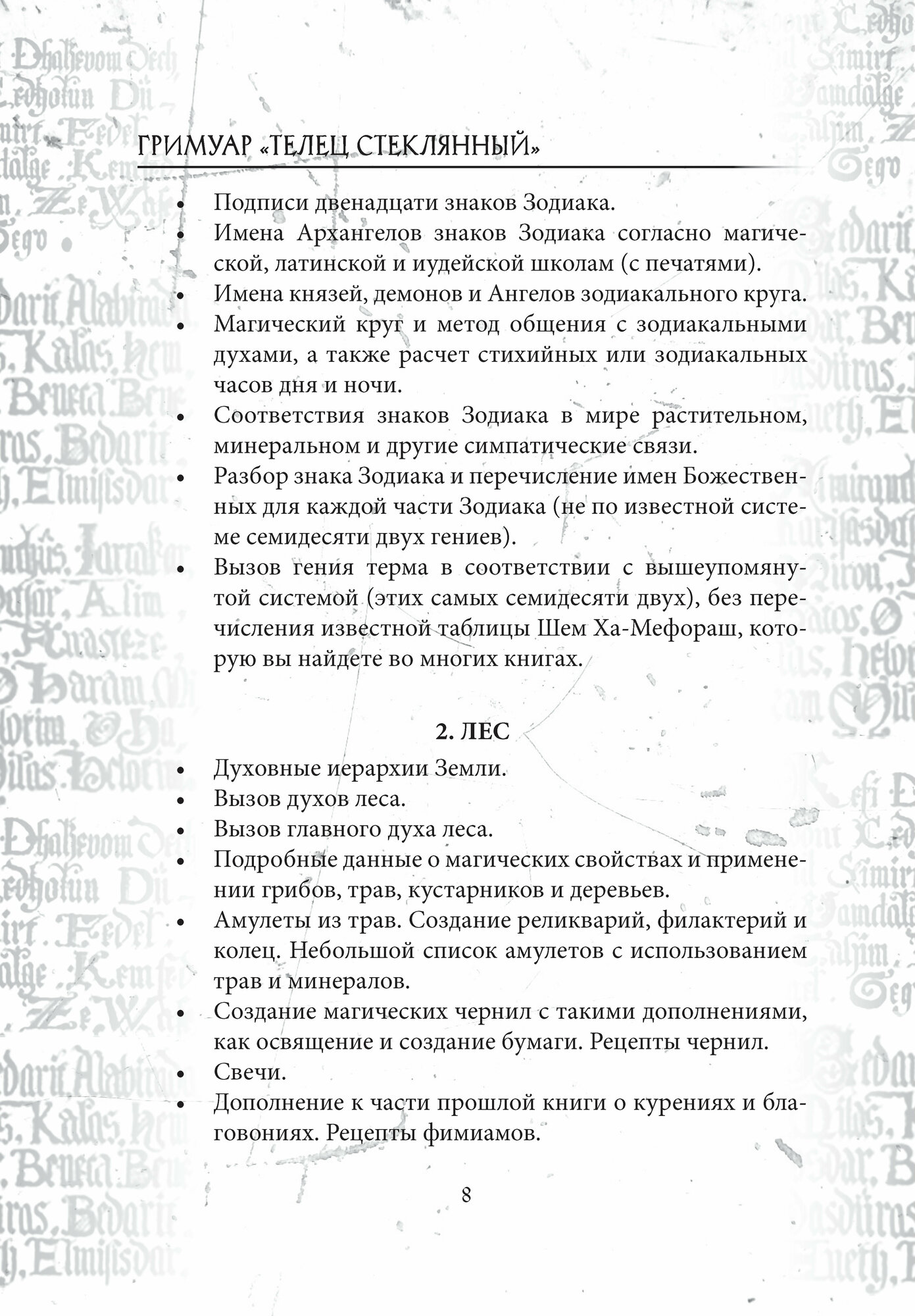Перед вами обновленное издание легендарной книги-гримуара Ивана Бенгальского – «Гримуар Телец Стеклянный. Grimuar Vitulum Vitrum». Это издание содержит в себе обновленную и откорректированную информацию. Книга посвящена различным эзотерическим сведениям, в том числе взятым из неиздававшихся ранее гримуаров. Здесь – ценнейшая практическая информация по различным, наиболее популярным областям эзотерики: магии планетарной, природной, колдовствe, новые изображения пантаклей (пентаклей) для различных целей. В части, посвященной планетарной магии, вы найдете: ритуал призывания сил планетарных новые печати планет заклинания, специально приспособленные к планетарной магии. Основу главы составляют: ритуал создания кристалла и приготовления видений создание круга и инструментов список духов с печатями и заклинаниями пантакли знаков зодиака, подписи знаков зодиака имена ангелов, магический круг и вызов гения терма информация о гениях человека. Часть природной магии содержит: ритуалы вызова духов леса данные о магическом применении некоторых трав о создании магических чернил, свечей, благовоний и курений, амулетов из трав. В книге также содержится новая информация о пантаклях: описание разных геометрических фигур на основе их магического использования коробка для хранения пантаклей с расшифровкой фигур, которые должны быть на ней освящение пантаклей. В главе, посвященной колдовству, описаны способы вызова элементалей, древа смерти и жизни, иерархия демонов, ритуалы, инструменты. Итак, книга с полным правом может считаться отдельным и своеобразным пособием по эзотерике и магии. Издание может быть рекомендовано всем, кто интересуется названными областями эзотерики, желает получить по ним новую, более полную и раскрытую информацию. Кроме того, все, кто занимается практикой магии, могут попробовать приспособить указанные в книге сведения к своим ритуалам.